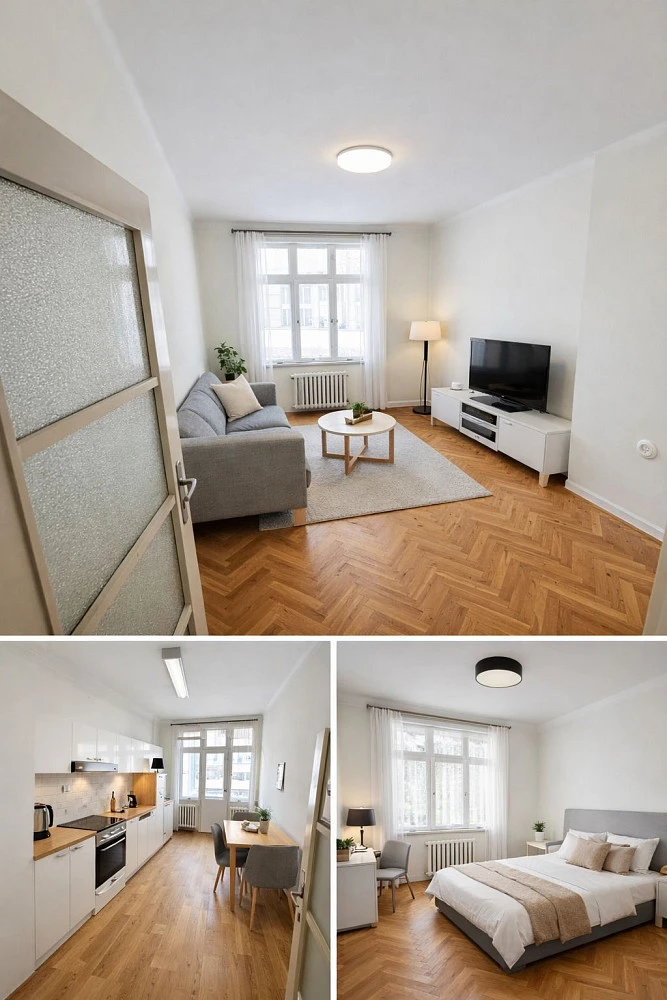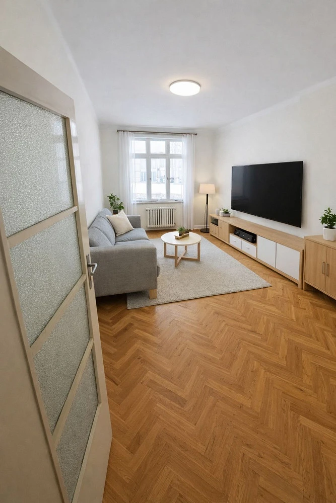 Dispozičně se jedná o 3+1. Díky své velikosti a umístění je byt vhodný jak pro rodinu, tak pro skupinu až pěti studentů.
