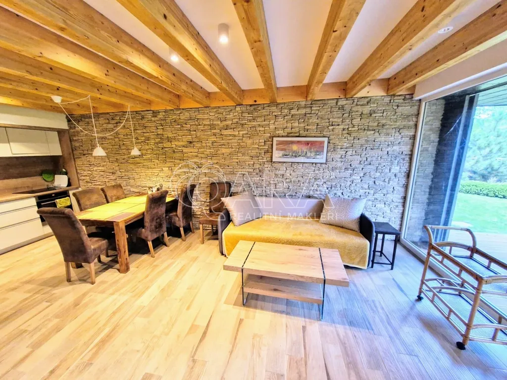 - Suterén: prostorná společenská místnost s krbem, plně vybaveným kuchyňským koutem a prosklenou stěnou navazující na terasu s výhledem do zeleně. Dále zde najdete technickou místnost (pračka, bojler), sklad zahradního nábytku, dřeva a první koupelnu se sprchovým koutem a toaletou.