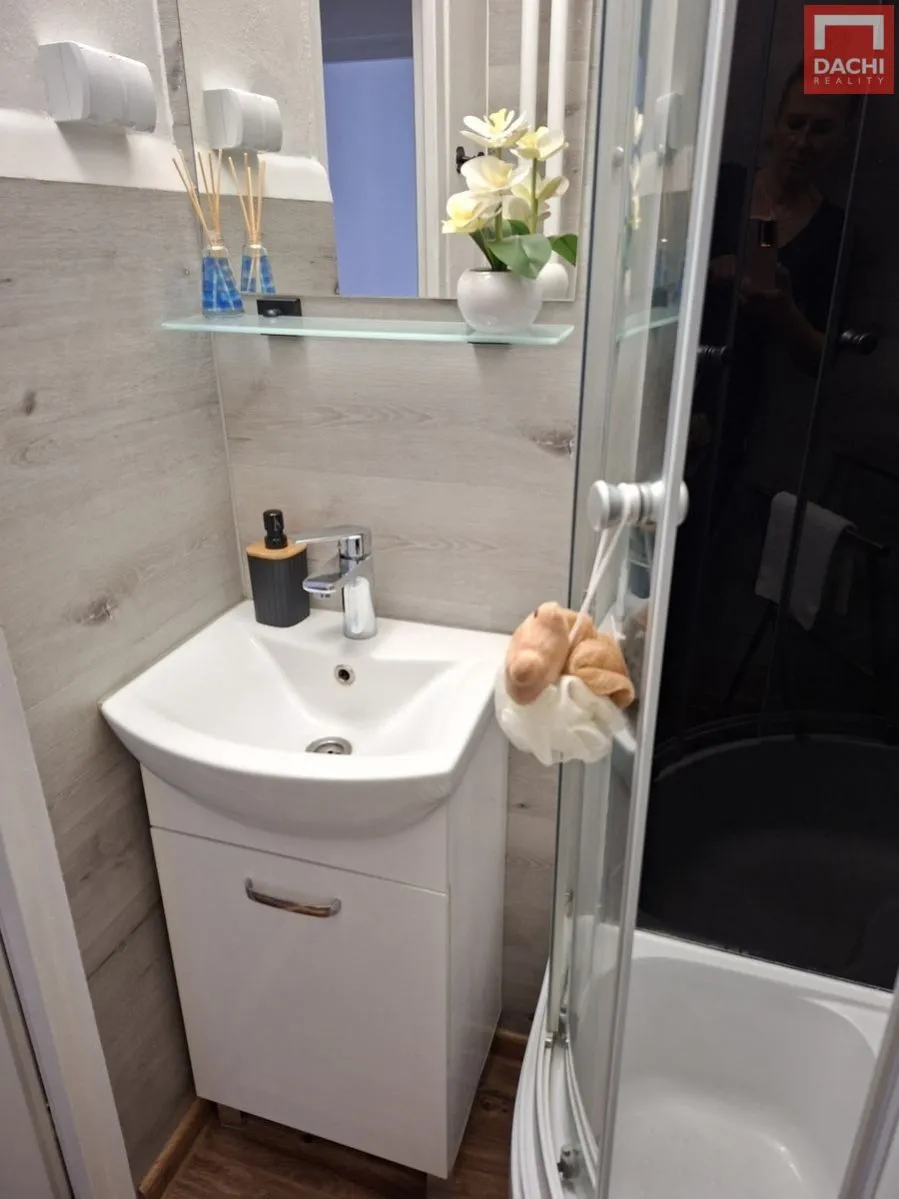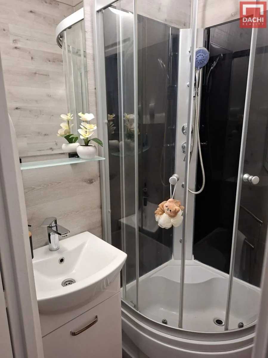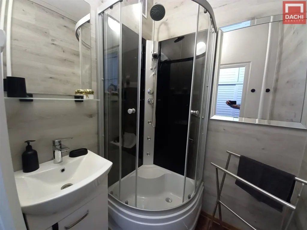 V kuchyni najdete kuchyňskou linku, plynový sporák, elektrickou troubu, stůl se židlemi a potravinovou skříň. V předsíni jsou zabudované skříně, které poskytují dostatek úložného prostoru pro vaše věci. Koupelna je vybavena sprchovým koutem a umyvadlem.
