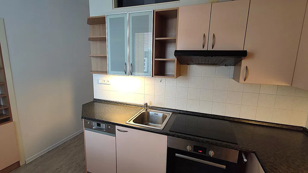 Kuchyňská linka je vybavena indukční varnou deskou, vestavěnou troubou a myčkou nádobí. Koupelna disponuje vanou i umyvadlem a díky zasklenému průhledu nad horními skříňkami kuchyně je do prostoru přivedeno příjemné denní světlo. WC je samostatné. Široká předsíň umožnila instalaci velkorysých úložných prostor vyrobených na míru, stejně jako většina nábytku v bytě.