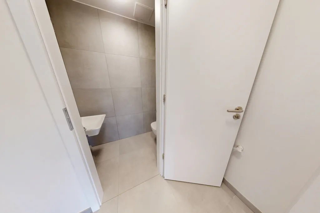 Prostorná koupelna disponuje vanou, samostatným sprchovým koutem, umyvadlovou skříňkou se zrcadlem a toaletu. Velkým benefitem je také technická místnost připravená pro pračku a samostatná oddělená toaleta, která zvyšuje komfort každodenního bydlení.