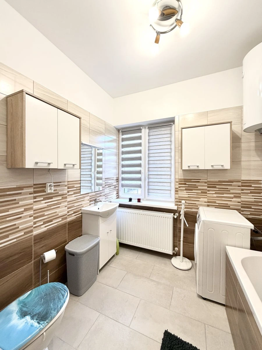Byt se nabízí částečně vybavený. Kuchyně disponuje myčkou, elektrickou troubou, varnou deskou, mikrovlnnou troubou a digestoří. Obývací část je zařízena pohovkou, konferenčním stolem a komodami. Součástí ložnice je velká šatní skříň a pohovka. V druhém pokoji najdeme komodu a dvě šatní skříně. V koupelně je vana, umyvadlo, toaleta, pračka a skříňky.