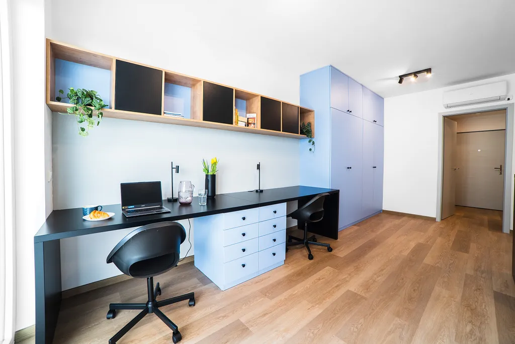Kuchyň je od pokoje oddělena vyvýšenou barovou skřňkou včetně tří barových židlí. Za barovým stolem se nachází dvě jednolůžkové postele, ze kterých jde ovšem vytvořit manželskou postel. Po pravé straně najdete 2 šatní skříně; 2 pracovní stoly s úložným boxem (vel. stolu 158 x 75 cm) + 2 x židle; 4 lampičky; knihovnu a magnetickou stěnu.