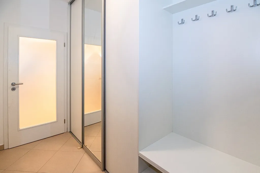 Vstup do bytu je prostorný s dostatkem úložného prostoru. Je zde na míru vyrobená šatní skříně + věšák a lavice s botníkem.
