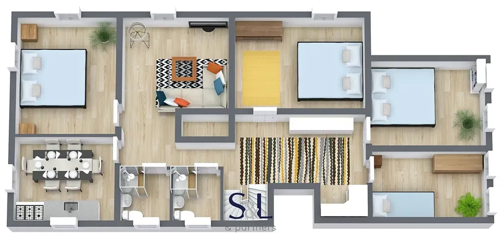 - celkem 11 pokojů, 3 kuchyně, 4 koupelny, velká společenská místnost a technické zázemí,