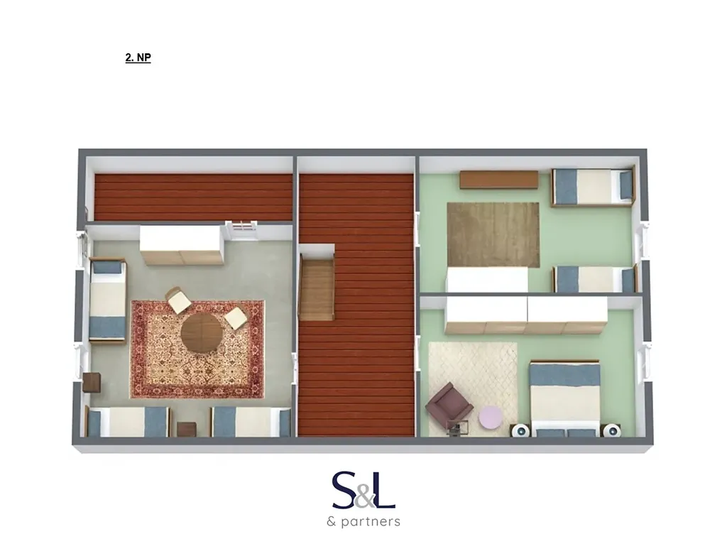 Jedná se o dvoupodlažní dům s celkovou užitnou plochou cca 195 m2, který disponuje čtyřmi ložnicemi, kuchyní a prostorným obývacím pokojem. Dále zde nalezneme koupelnu vybavenou sprchovým koutem i vanou, samostatnou toaletu, dílnu a půdní prostor.