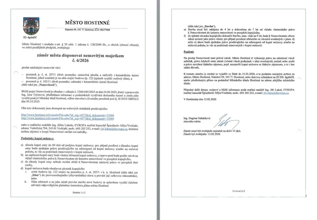 Nemovitost je ve vlastnictví města Hostinné a je třeba splnit několik stanovených podmínek. Ta nejdůležitější podmínka je závazek kupujícího uvést předmětný objekt do provozuschopného stavu či stavbu odstranit a zahájit výstavbu nového objektu (stavba musí být zahájena do 4 let od nabytí a dokončena do 7 let). Kompletní informace jsou v záměru města, který je rovněž v inzerci.
