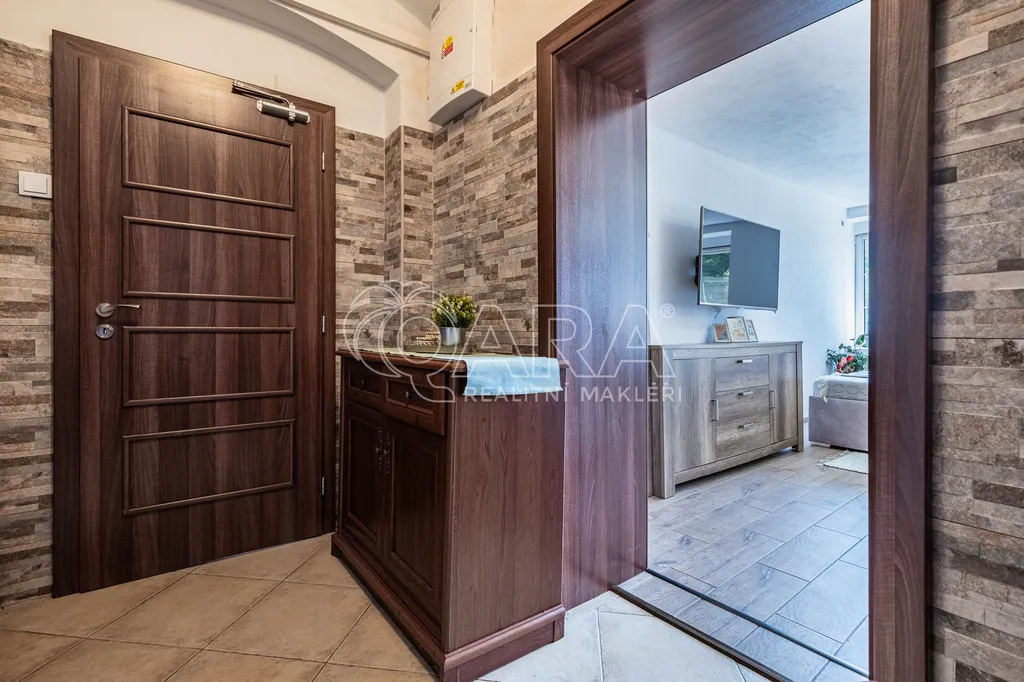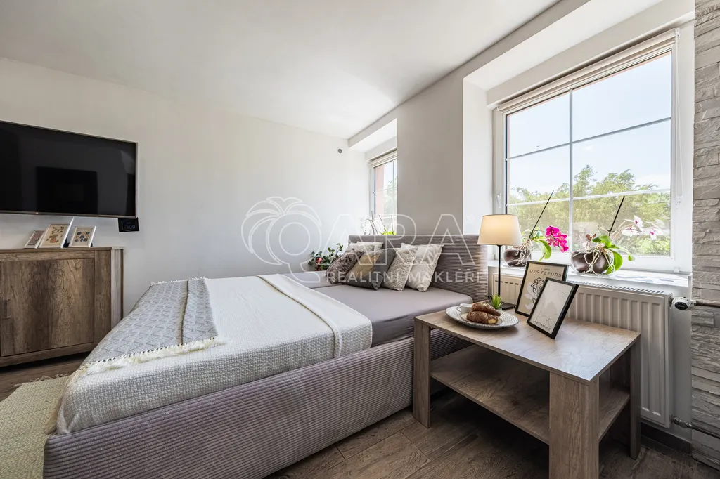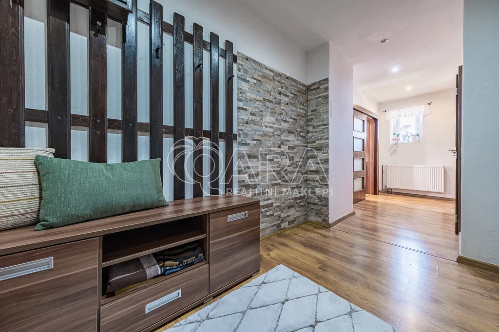 Do domu se vchází bývalým průjezdem, ze kterého je nyní uděláno prostorné garážové stání, takže pěkně suchou nožkou z domu do auta. Vjezd je opatřen novými elektrickými garážovými vraty se samostatným vstupem "pro pěší". Je zde umístěný Wallbox - nabíjecí stanice pro dvě elektroauta. Z průjezdu se vchází do přízemí domu nebo rovnou na zahradu. V přízemí je situován samostatný byt 1+kk, který je možno využít jako kancelář či máte-li odrostlejšího potomka a chce se cítit tak trochu samostatně, i zde je tato možnost, nebo pronájem. Byt je vybaven plně funkční kuchyňskou linkou, velkou a pohodlnou manželskou postelí s nočními stolky, komodou a TV, jídelním stolem a velkorysou šatní skříní na míru, prostornou koupelnou se sprchovým koutem a toaletou.