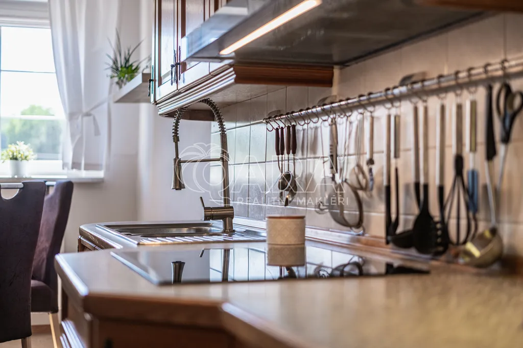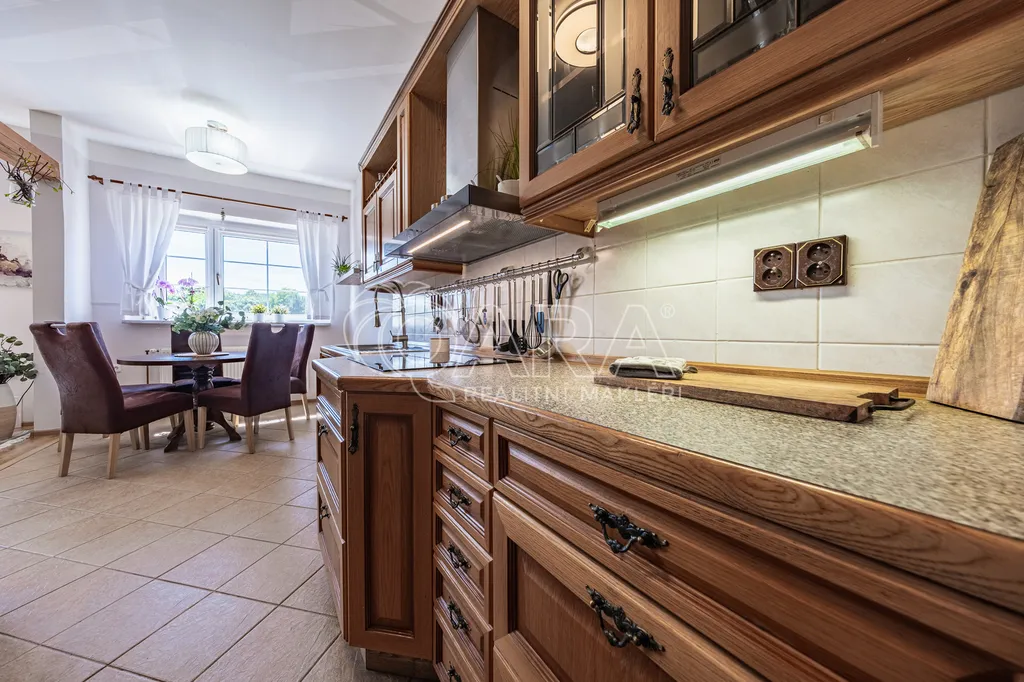 Dominantou horního podlaží je prostorný a světlý obývací pokoj decentně sladěný a propojený s kuchyní, také plně funkční, jídelním koutem a pracovním prostorem. Na obývací pokoj navazuje útulná vybavená ložnice, a další ložnice, která je nyní využívána jako šatna, tělocvična a pracovna paní domu.