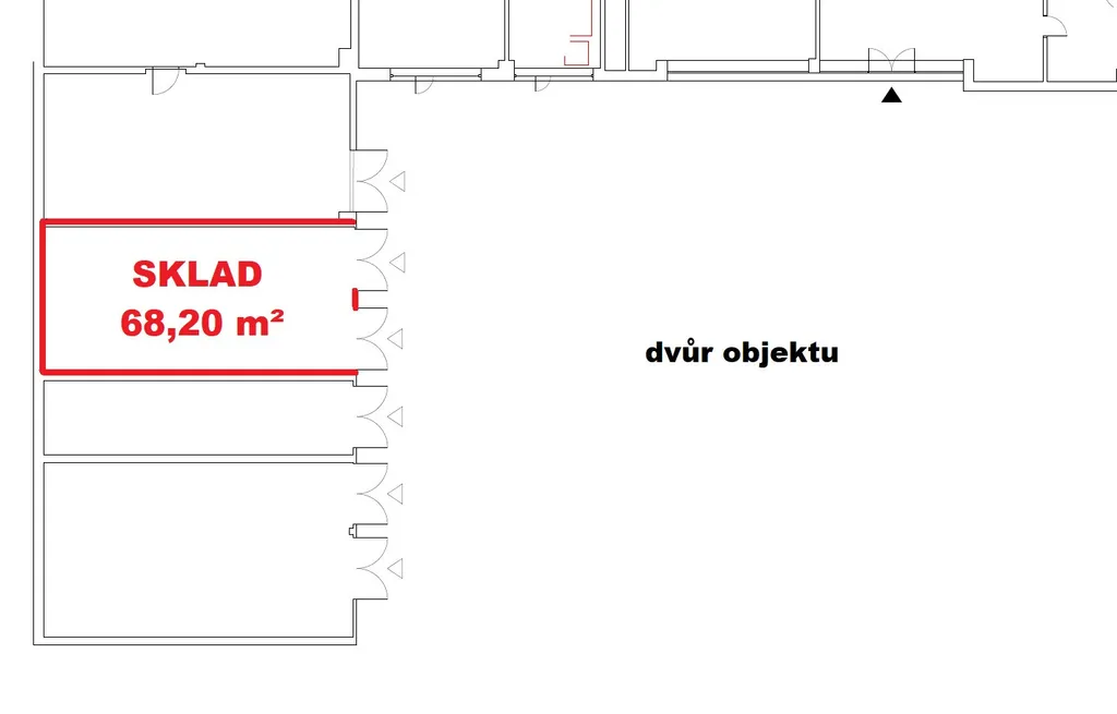Ve skladu je osvětlení, elektřina o napětí 230 V a 400 V. Sklad je cca 12 m dlouhý a 5,7 m široky. Přístup je možný ze dvora objektu přes dvoje vrata (futra výška 2,4 a šířka 2,4 m). Na prostorném dvoře před skladem je možná pohodlná nakládka – vykládka nákladních vozidel do 9 tun. Dvůr je zajištěn závorou.