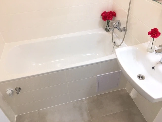 Byt má vyzděné jádro, podlahy, rozvody, omítky, interiérové dveře. Koupelna s vanou a umyvadlem s místem pro připojením pračky, toaleta je odděleně.