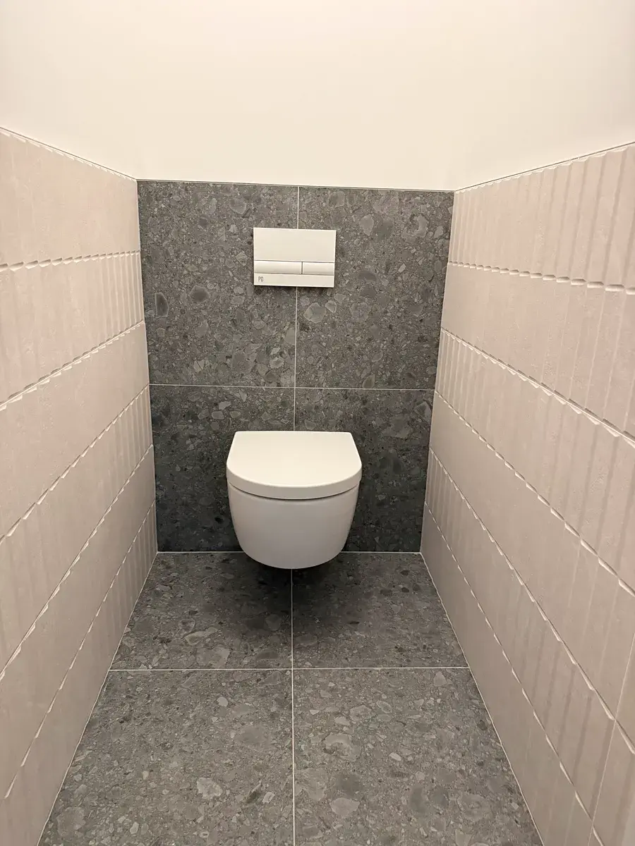 Koupelna je zpracována ve velmi vysokém standardu, s kvalitními obklady, moderní sanitou a designovou sprchovou zástěnou, což podtrhuje celkový prémiový charakter bytu. K bytu náleží také sklepní kóje a garážové parkovací stání přímo v domě.