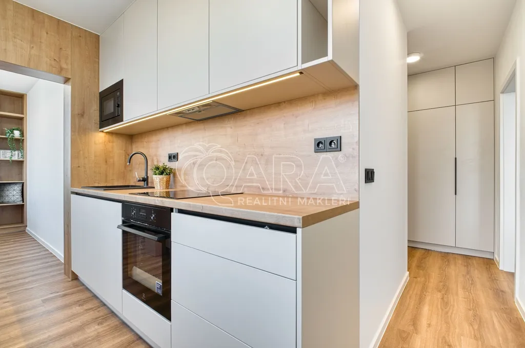 Velká vstupní chodba s vestavěnými skříněmi řeší to, co většina bytů neumí – dostatek místa pro věci bez kompromisů v obytných místnostech.