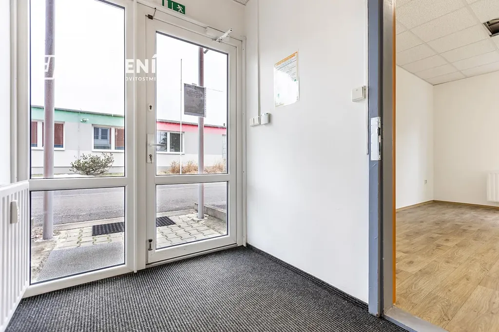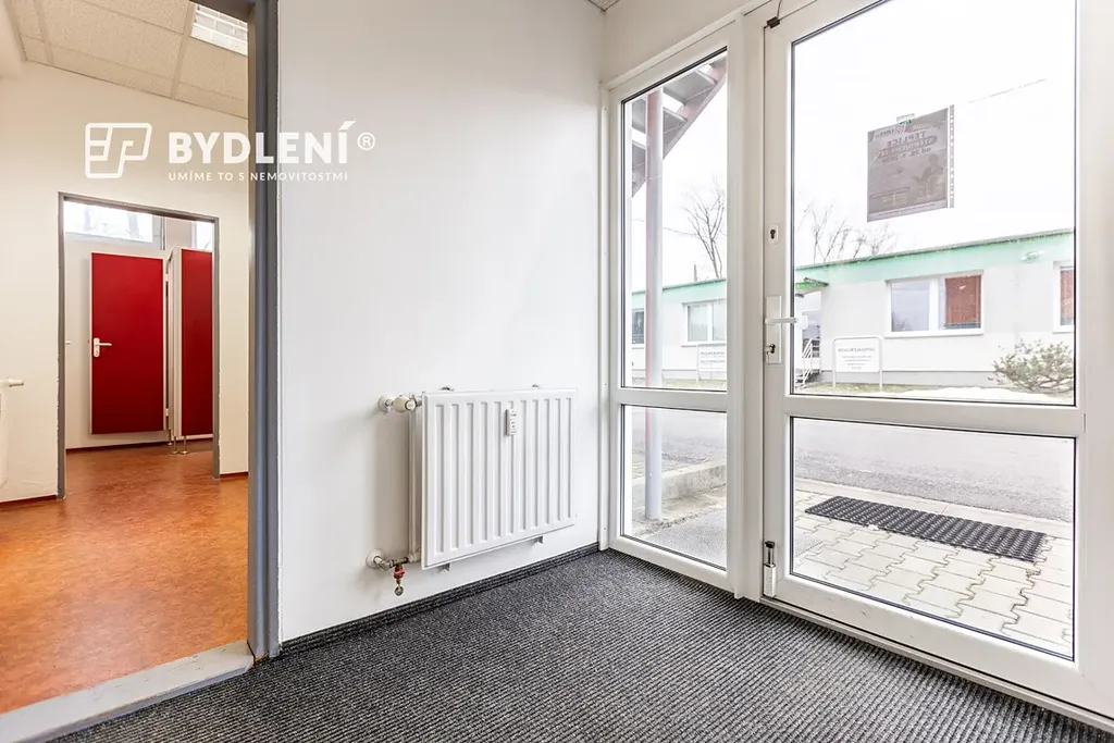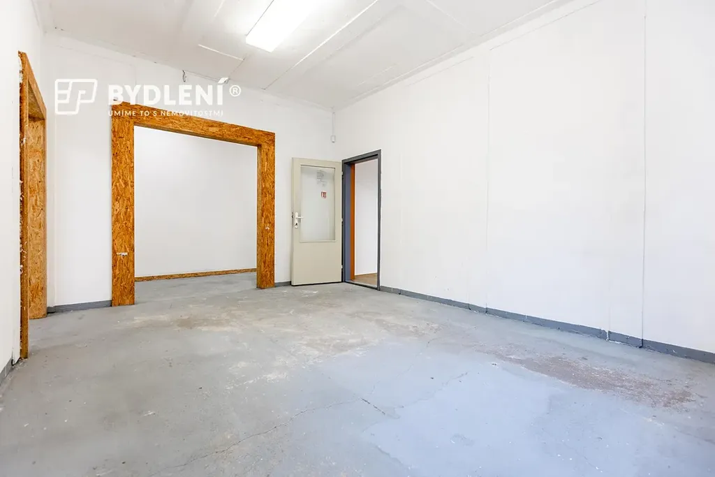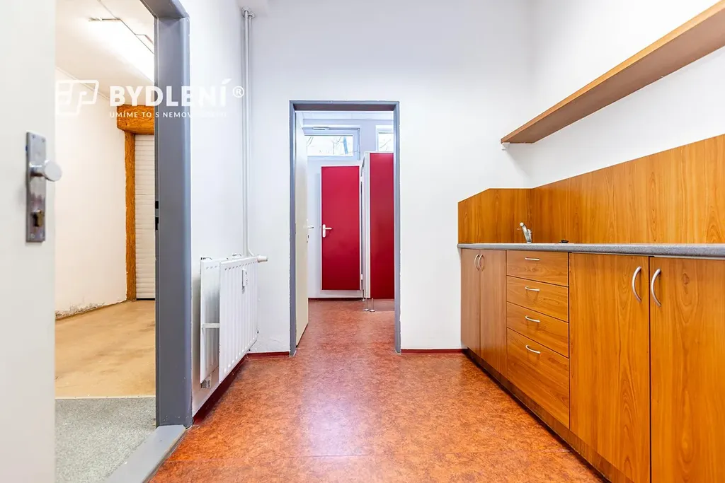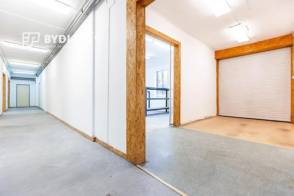 Dispozičně nabízí kancelář, kuchyňku, sociální zázemí (WC), tři menší průchozí sklady, jeden velký sklad a spojovací chodbu. Velkou výhodou jsou sekční vrata pro pohodlné zásobování a manipulaci se zbožím.