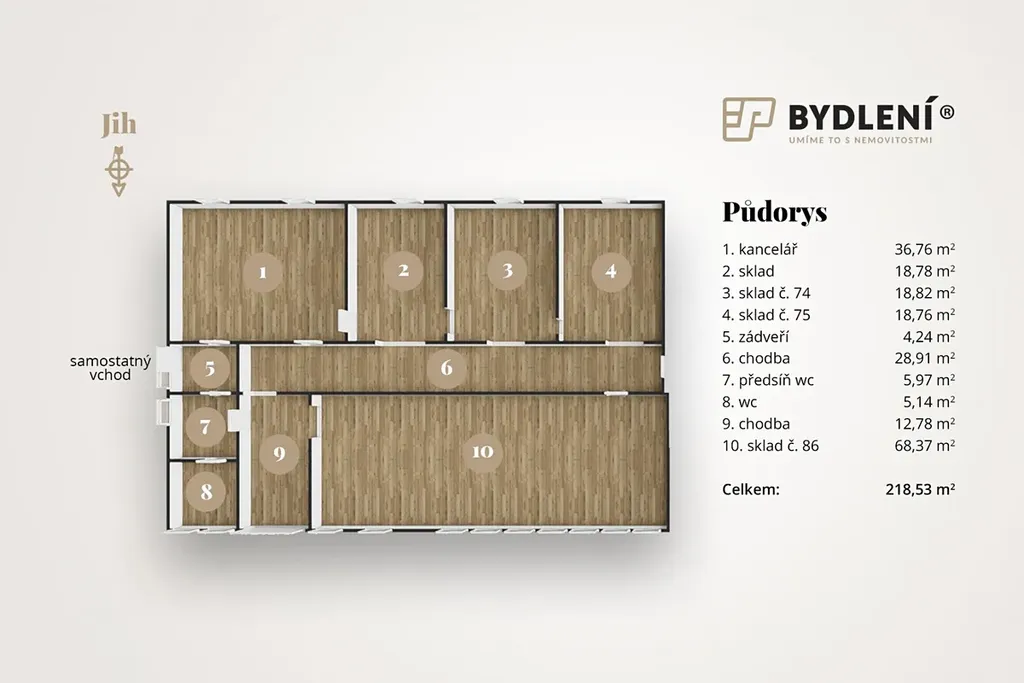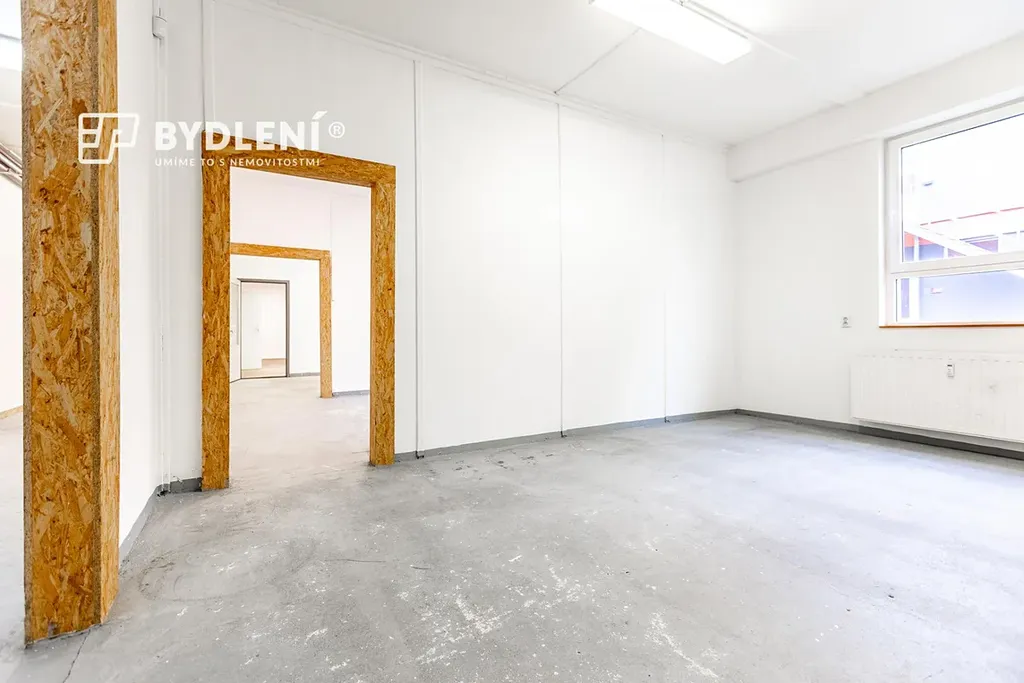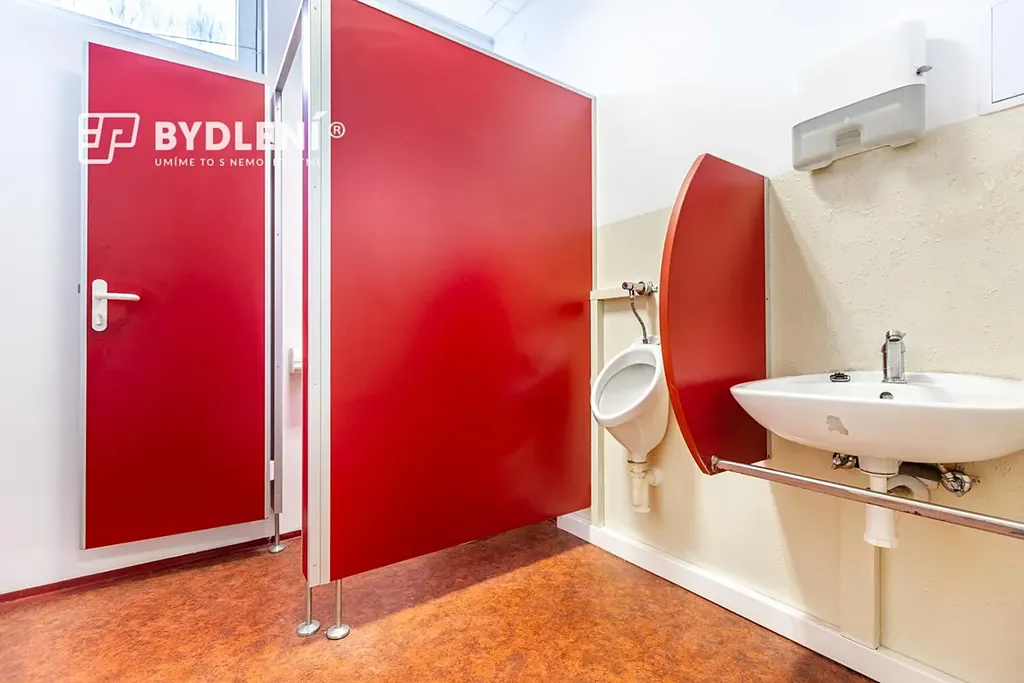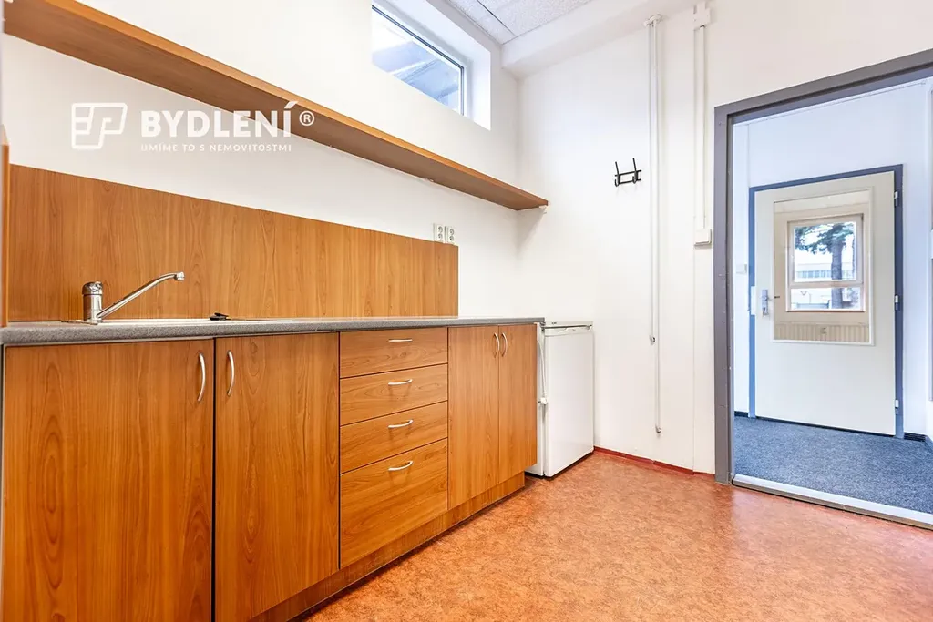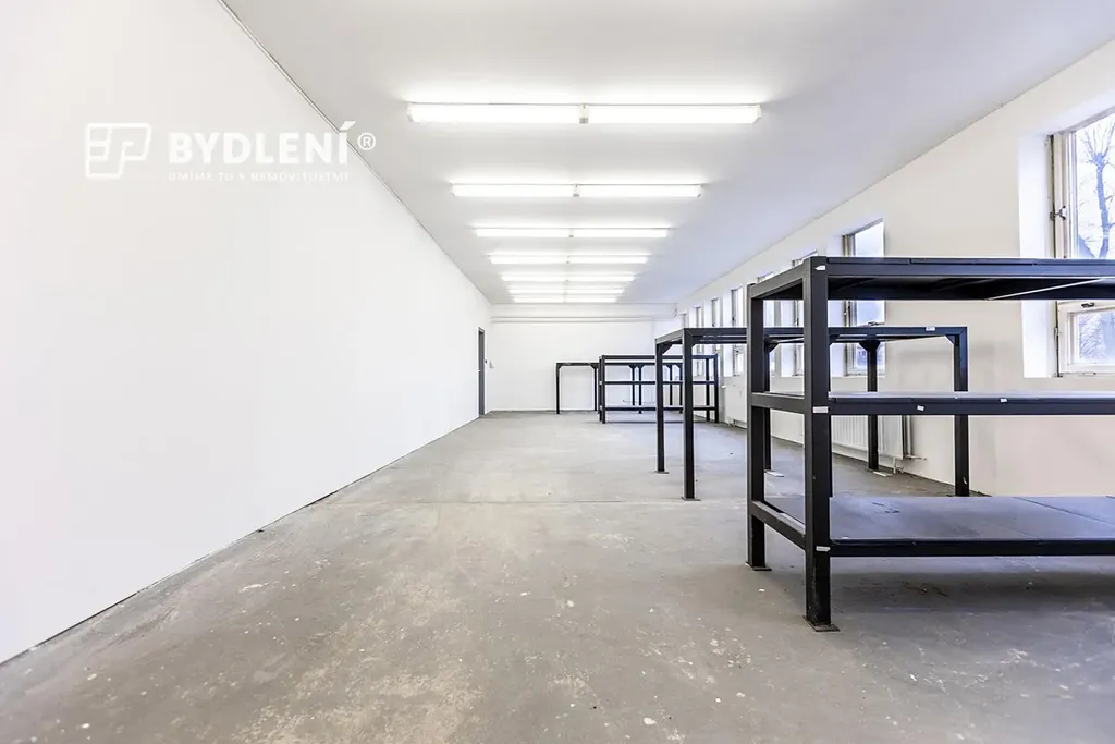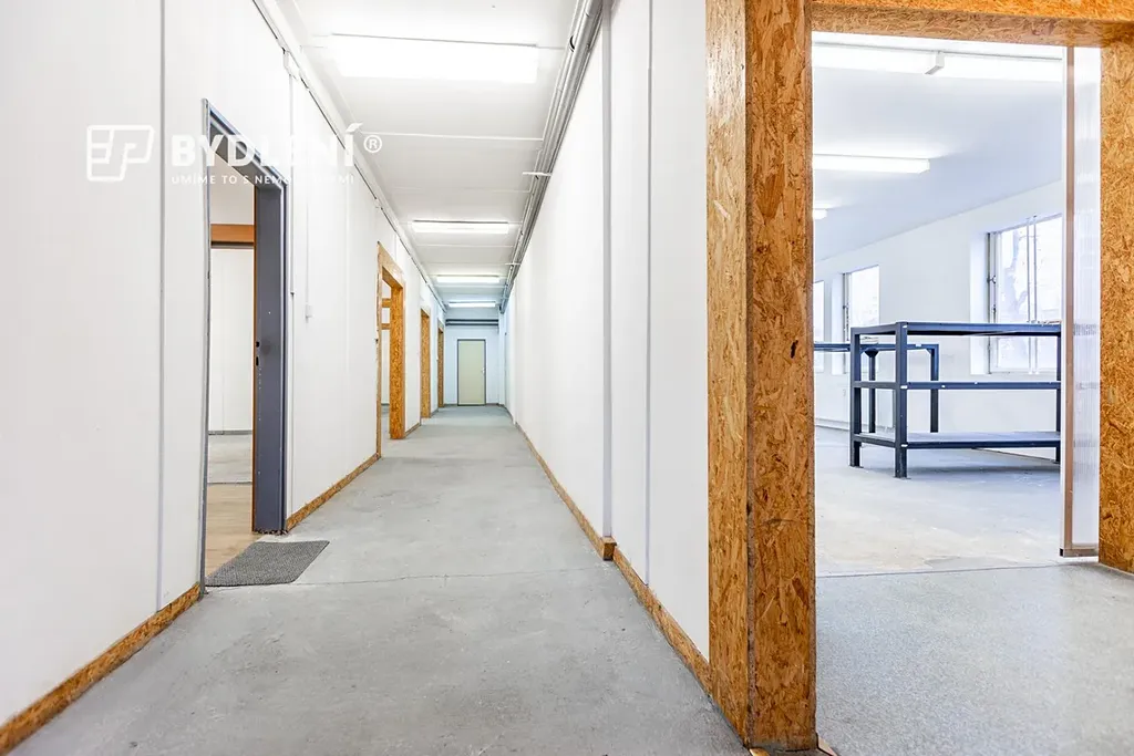 Dispozičně nabízí kancelář, kuchyňku, sociální zázemí (WC), tři menší průchozí sklady, jeden velký sklad a spojovací chodbu. Velkou výhodou jsou sekční vrata pro pohodlné zásobování a manipulaci se zbožím.