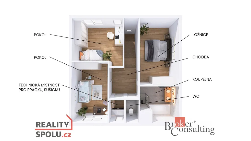 a zahradu, několik samostatných pokojů pro rodinu i práci z domova a další využitelný prostor v podkroví. Parkování pro dvě auta je zajištěno přímo u domu.