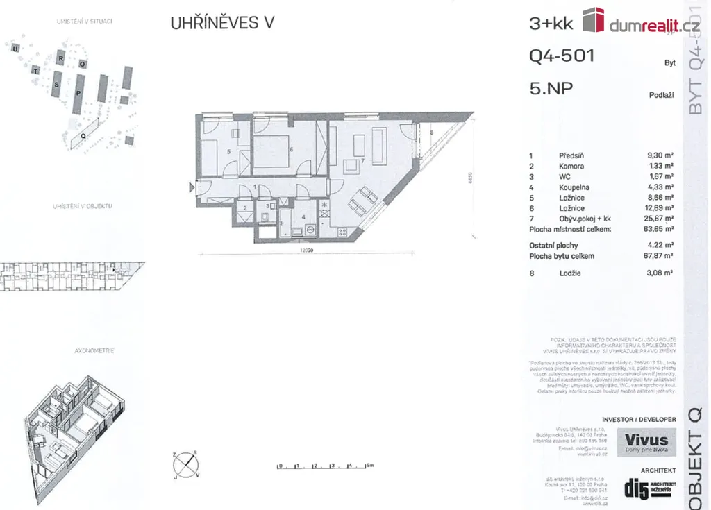Nabízíme ke koupi světlý byt 3+kk o celkové ploše 67,87 m², doplněný rohovou lodžií o velikosti 3 m² orientovanou na východ. Byt se nachází v 5. patře z celkových 6 moderního domu s výtahem, který byl zkolaudován v říjnu 2022 v rámci developerského projektu společnosti Vivus v Uhříněvsi. Dispozice bytu je velmi praktická. Po vstupu se nachází centrální předsíň, ze které je přístup do prostorného obývacího pokoje s kuchyňským koutem. Kuchyňská linka je plně vybavena indukční varnou deskou, horkovzdušnou troubou, myčkou nádobí a lednicí s mrazákem. Dále byt nabízí dvě samostatné ložnice, koupelnu s vanou a pračkou a oddělené WC. Součástí bytu je také praktická komora. Byt je velmi dobře zateplený, s nízkými provozními náklady, a nachází se v klidné lokalitě v centru Uhříněvsi. V bezprostředním okolí je supermarket Billa, restaurace i velké multifunkční hřiště. Kompletní občanská vybavenost je dostupná v pěší vzdálenosti. Výborná dopravní dostupnost – vlakem do centra Prahy cca 20 minut. Cena bytu: 9 800 000 Kč. K bytu je v kupní ceně zahrnuto kryté garážové stání v přízemí domu za cenu 500 000 Kč. Nemovitost je vhodná jak pro vlastní bydlení, tak i jako atraktivní investiční příležitost. Ev. číslo: 654766.