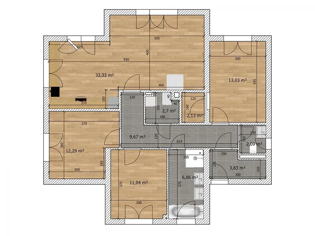 Nemovitost bude částečně vytápěna podlahovým topením, přičemž hlavním zdrojem tepla bude plynový kondenzační kotel umístěný v technické místnosti. Doplňkové vytápění zajistí teplovzdušná krbová kamna na tuhá paliva umístěná v obývacím pokoji.