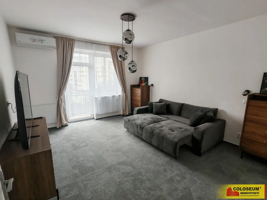 Obývací pokoj s rozkládací sedačkou a televizorem, se vstupem na balkon orientovaný do tichého vnitrobloku.