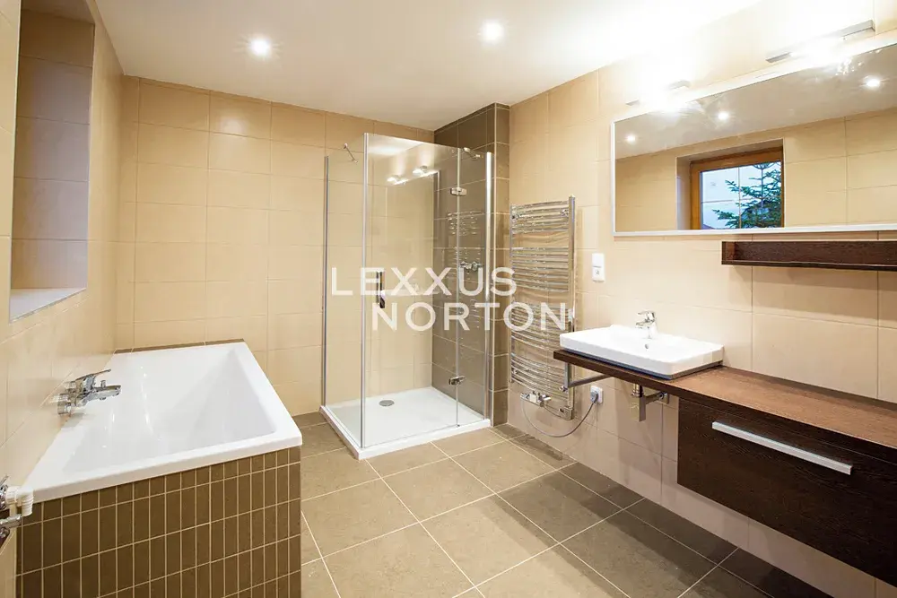 Kuchyňský kout nabízí kompletní vybavení včetně sklokeramické varné desky, trouby, lednice s mrazákem, myčky nádobí a mikrovlnné trouby. Koupelny disponují vanou i sprchovým koutem.