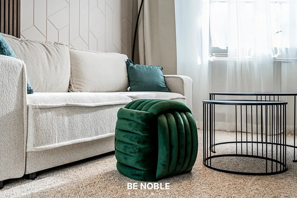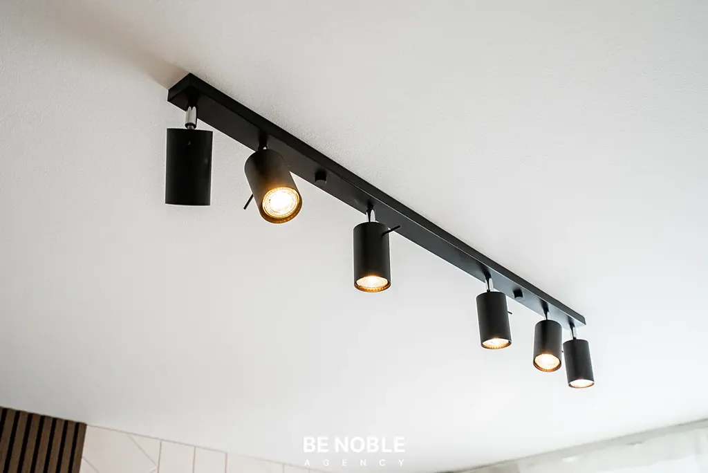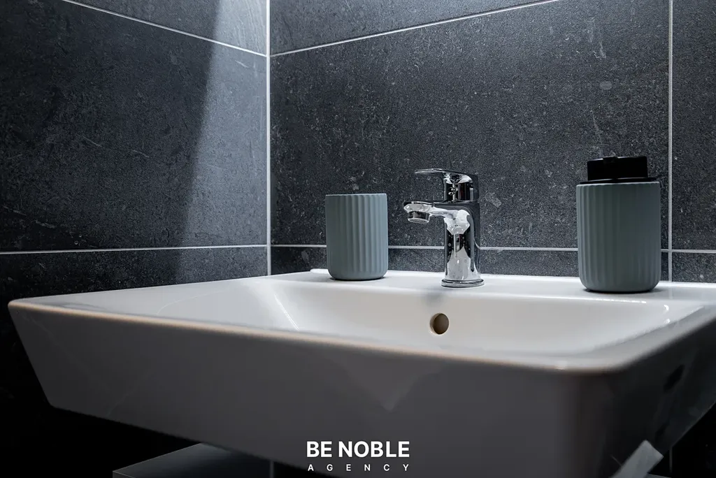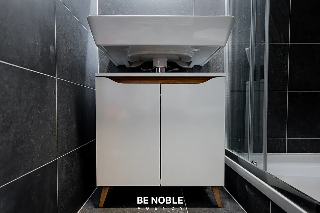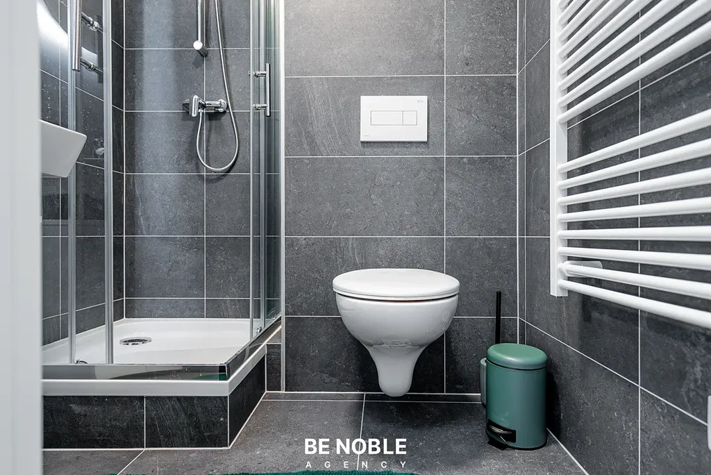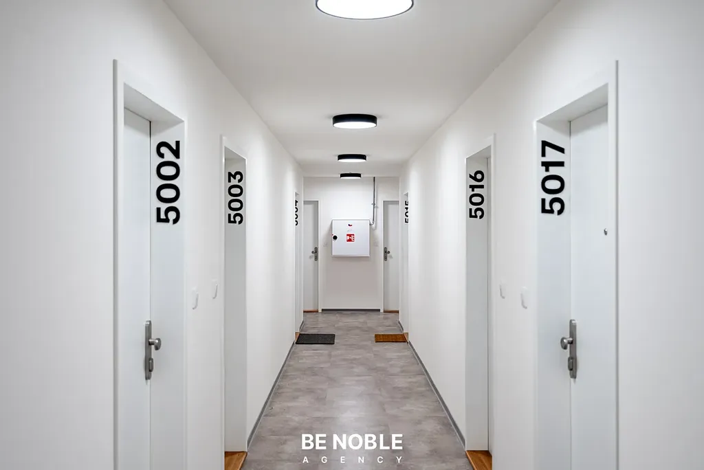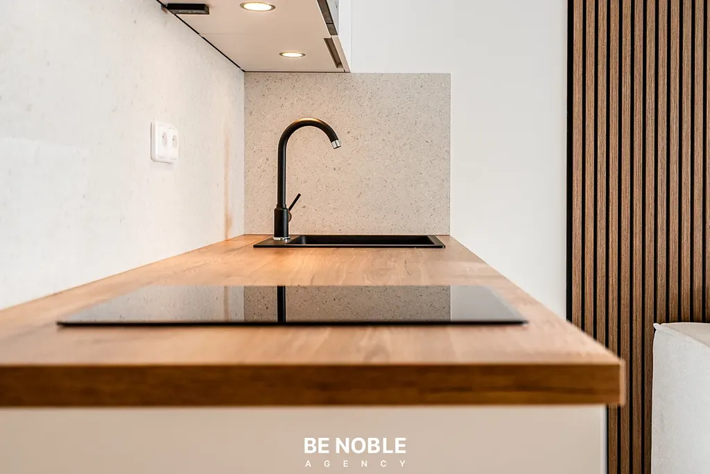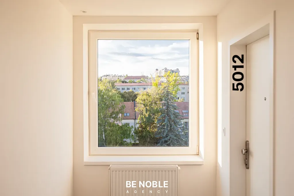 Byt byl navržen tak, aby dokonale využil každý centimetr prostoru a zároveň působil útulně i elegantně. Součástí je moderní kuchyňská linka s dostatkem úložných prostor, varnou deskou, lednicí, mikrovlnnou troubou a vestavěnou digestoří. Obytná část je vybavena kompletním nábytkem, dekorem a osvětlením od společnosti Bonami v celkové hodnotě přes 350 000 Kč – tedy nejen kuchyní, ale i pohovkou, komodou, stolem, závěsy, záclonami a designovými svítidly. Výsledkem je byt, který je připraven k okamžitému užívání nebo pronájmu – bez nutnosti dalších investic. Velké okno orientované do klidného vnitrobloku zajišťuje dostatek světla a příjemný výhled z 5. patra. V koupelně se nachází sprchový kout, toaleta a úložné prostory pod umyvadlem.