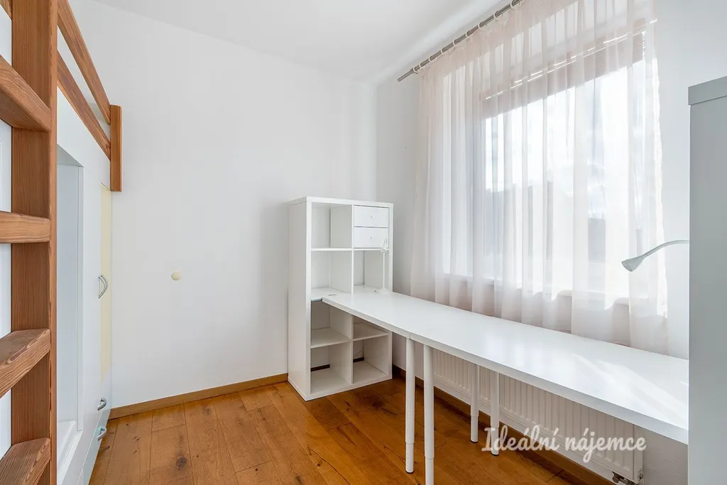 Byt má dále dva samostatné pokoje. Jeden je světlý, s oknem, aktuálně vybavený patrovou postelí, dvojicí pracovních stolů, knihovnami a dostatkem úložných prostor. Druhý pokoj, přístupný přes posuvné dveře z obývacího pokoje, slouží jako klidová ložnice – je tichý a nabízí pohodlné spaní i vestavěné úložné prostory. Samostatná šatna výrazně pomáhá udržet byt vzdušný a přehledný. Předsíň je vybavena skříní, botníkem a věšákem, takže odkládání oděvů a obuvi je pohodlné. Koupelna působí prostorně – kromě vany, umyvadla a zrcadla zde najdete praktickou koupelnovou skříňku, pračku a toaletu.