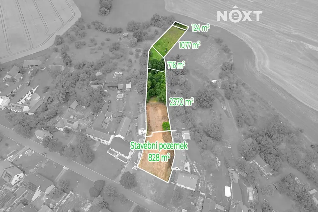 Z celkové plochy je 828 m² čistě stavební parcela určená k výstavbě rodinného domu.