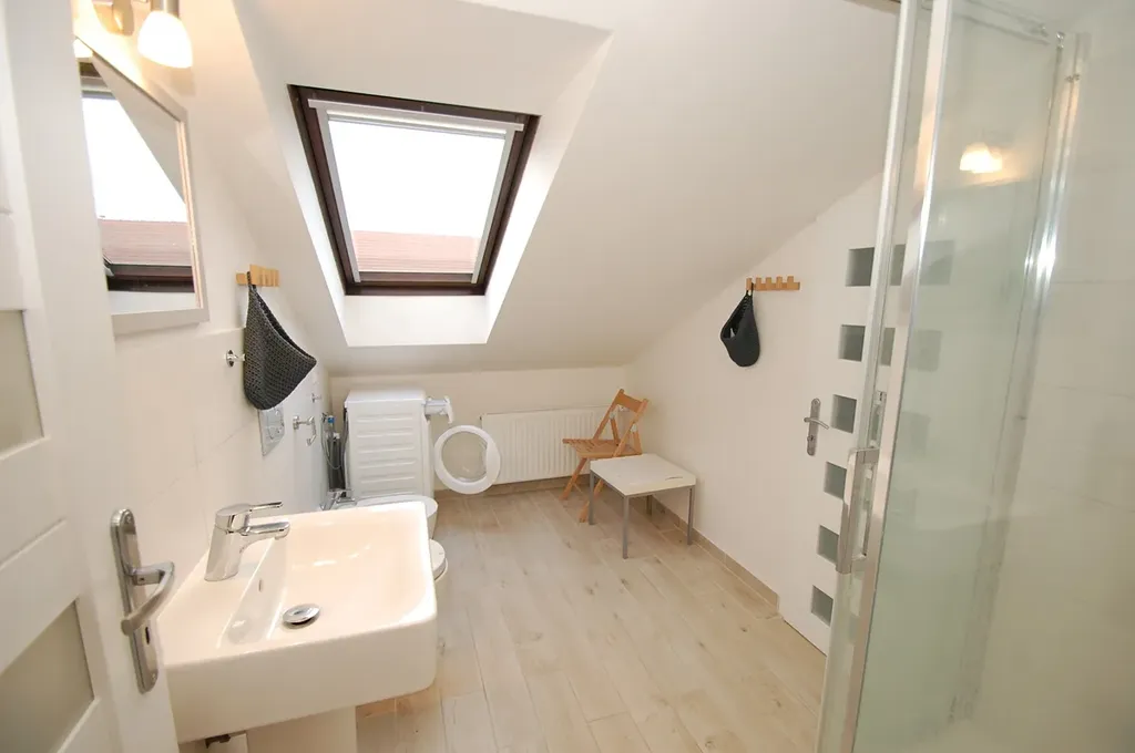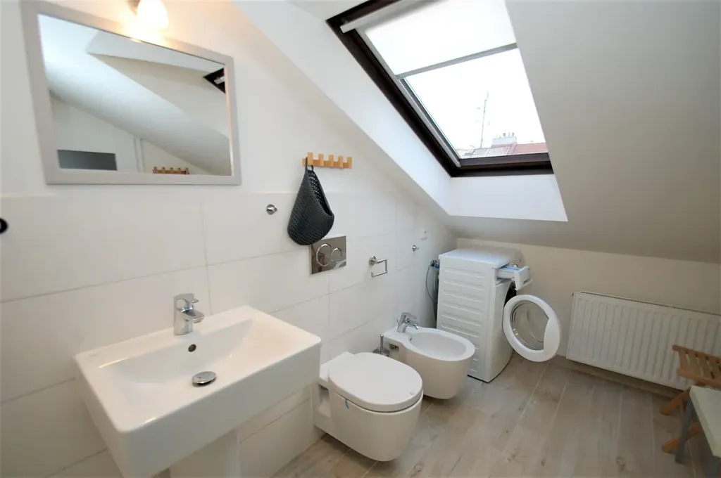 Zařízený, podkrovní 1+kk, 56 m2, Praha 2 Vinohrady, jen 3 minuty od Náměstí Míru. Byt se skládá z velkého pokoje s kuchyňským koutem, šatny a koupelny se sprchou, toaletou a bidetem. Na zemi jsou parkety, topení elektrickým kotlem.