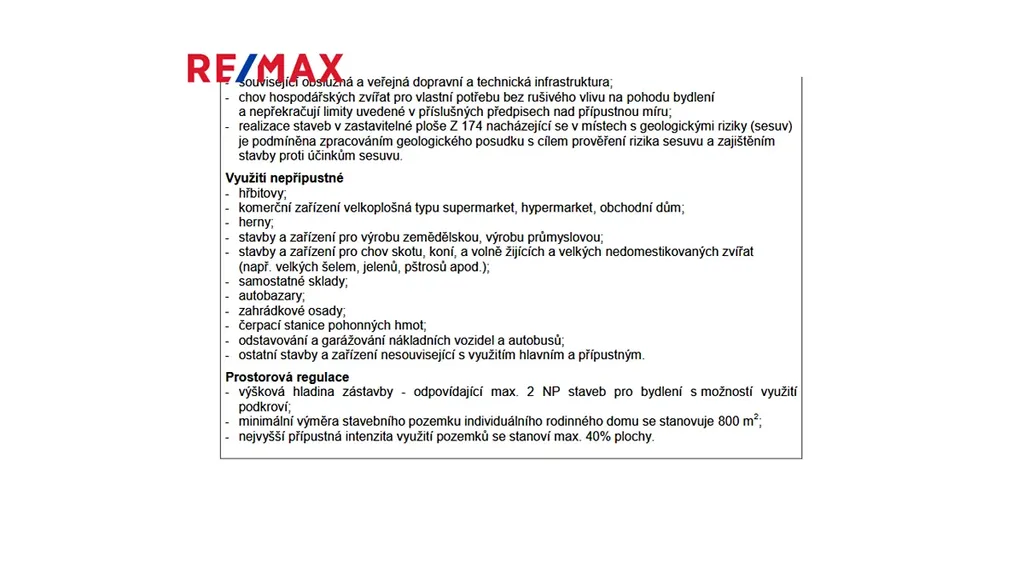 Pozemky mají rovinatý profil, dle územního plánu jsou vedeny v zastavitelném území, BI – bydlení individuální, s podmínkou realizace staveb do výšky 2.NP, s min. plochou pozemku 800m² a mírou intenzity využití pozemku pro výstavbu max. 40% plochy.