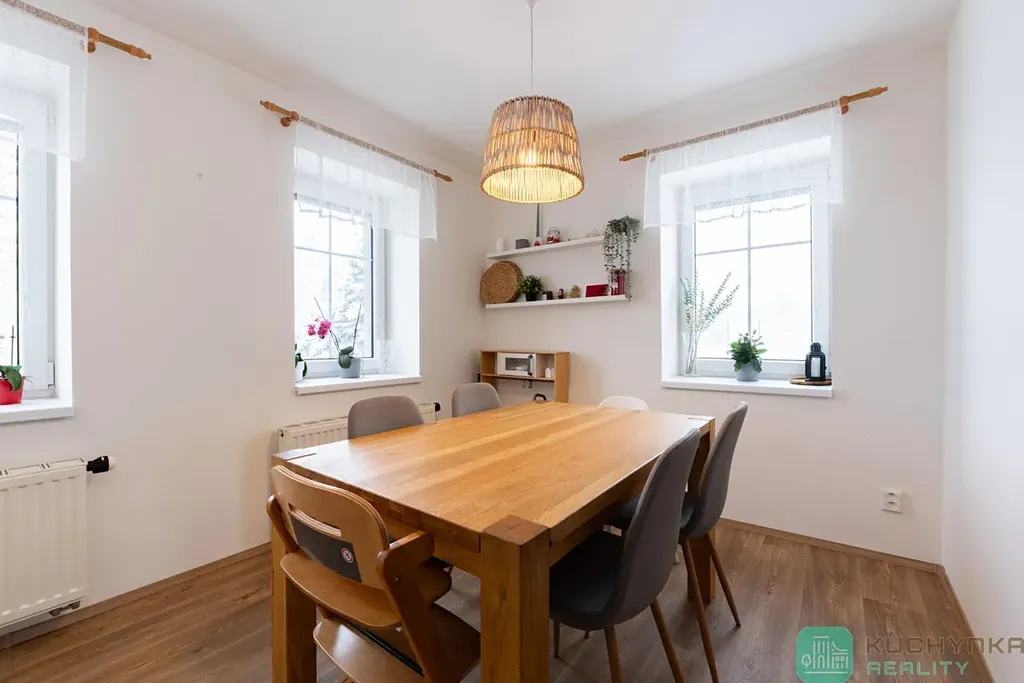 Plně vybavená kuchyňská linka od Ikea s vestavnými spotřebiči, snížené stropy sádrokartonem, vinylové podlahy, teplovodní rozvod s radiátory, v přízemí podlahové vytápění, elektřina v mědi, voda i odpad v plastu, přiznané trámy v podkroví, zateplení obálky domu 12 cm polystyrenem (chybí pouze finální fasáda), izolace střechy 30 cm vata. Prostě povedená rekonstrukce v trendy barvách.