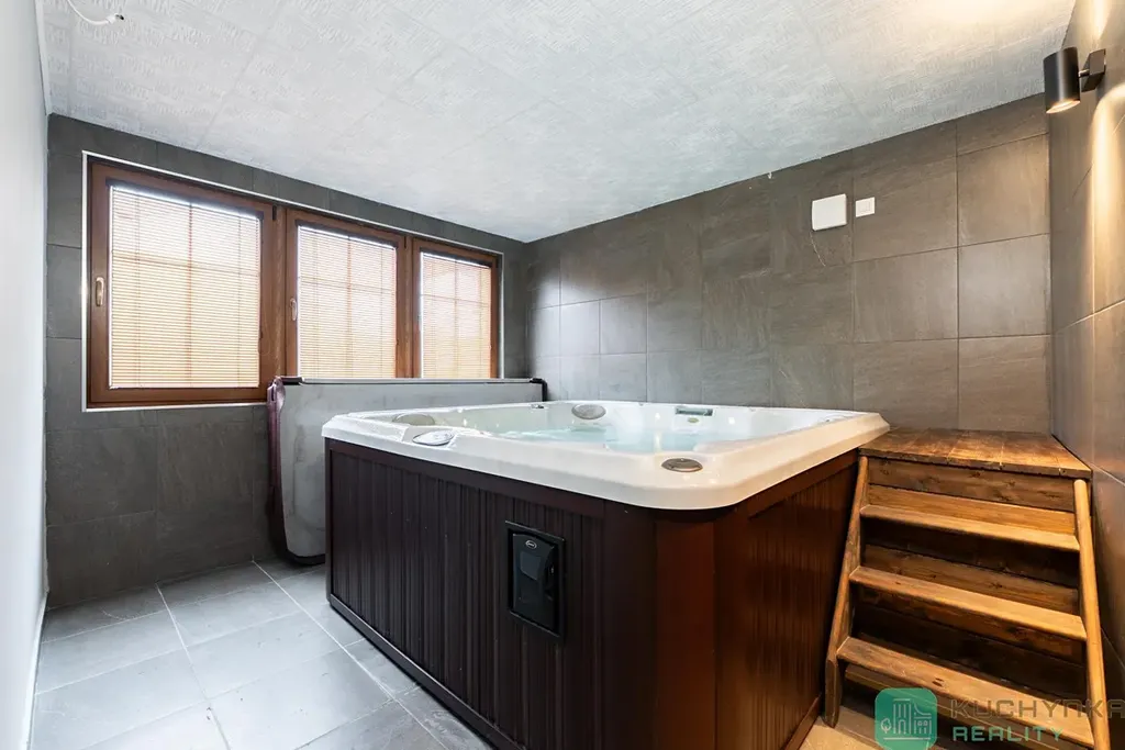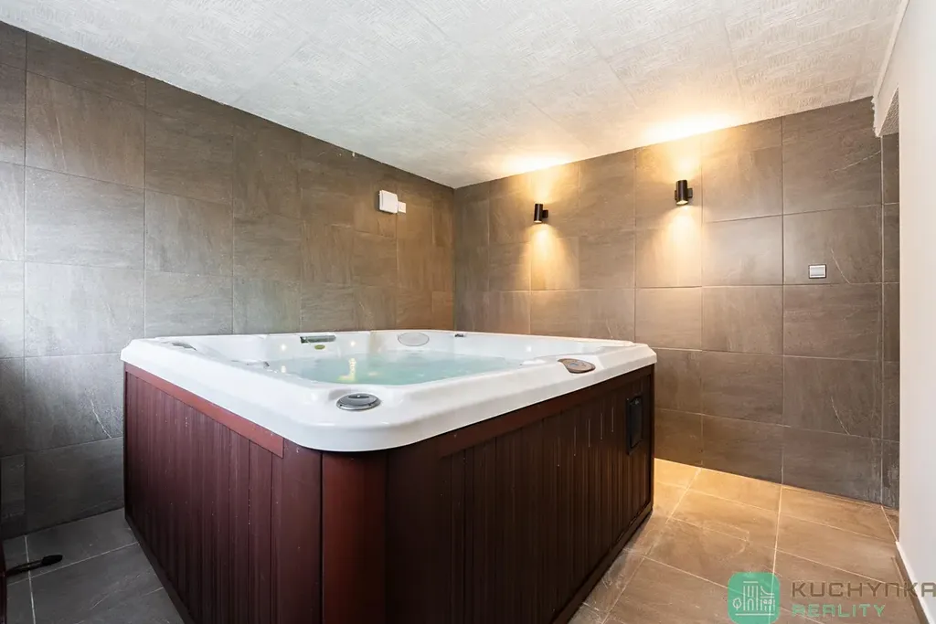 V přízemí (cca 72 m2) je vstupní chodba, prostorná šatna, vstupní chodba do wellness, odpočinková zóna, 2 x zázemí sprch + toaleta, dvě sauny a velká Jacuzzi vířivka pro 6 osob. Podlahové vytápění je příjemným překvapením.