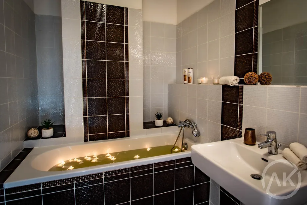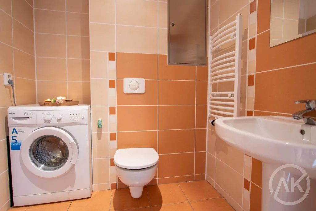 - je tady fakt velká vana i celá koupelna. Vlastně i záchod je nějak větší než obvykle. Dokonce tolik, že se tam vejde pračka,