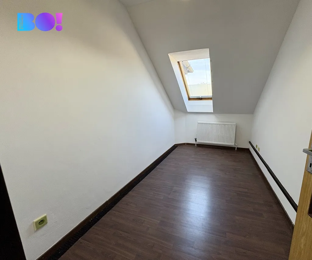 Dispozice prostor zahrnuje vstupní chodbu, sociální zázemí s koupelnou (vana), samostatné WC a bidet, dále dvě oddělené kanceláře a prostornou hlavní kancelář s kuchyňským koutem, která je ideální jako open space, zasedací místnost či hlavní pracovní prostor. Podkrovní charakter dodává interiéru osobitý styl a příjemné pracovní prostředí, přičemž celková plocha nabízí dostatek prostoru pro menší firmu, administrativní zázemí či poradenské služby.