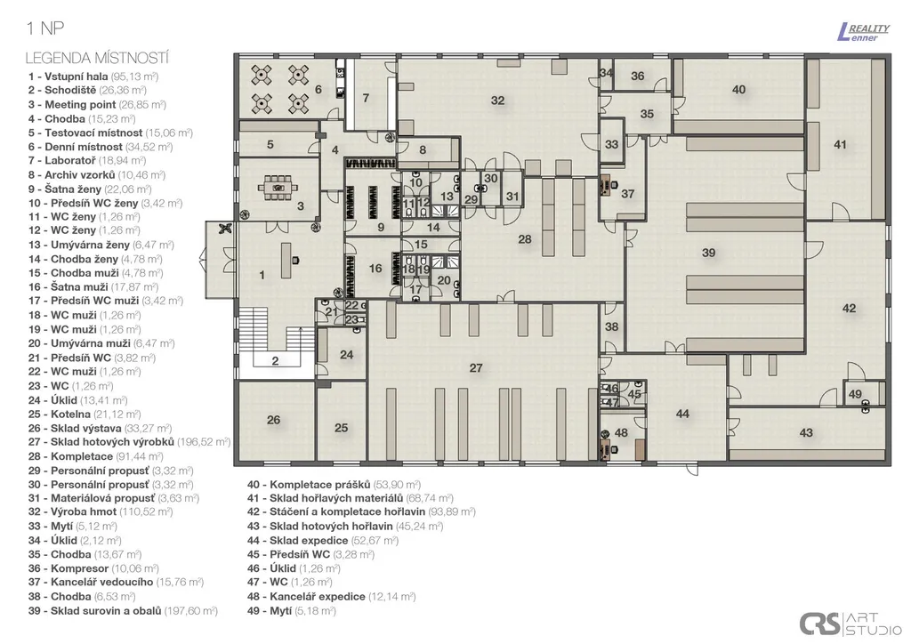 V přízemí areálu cca 1.500 m2 se nacházejí: sklad (hotových výrobků, surovin a obalu, hořlavých materiálů, hořlavých surovin, prostor pro plnění hořlavých materiálu, prostor pro plnění kosmetických přípravků, laboratoř - prostor pro plnění a balení, prostor pro expedici a příjem zboží, jídelna pro zaměstnance, pánské a dámské šatny, sklad inventáře, technické místnosti atd.