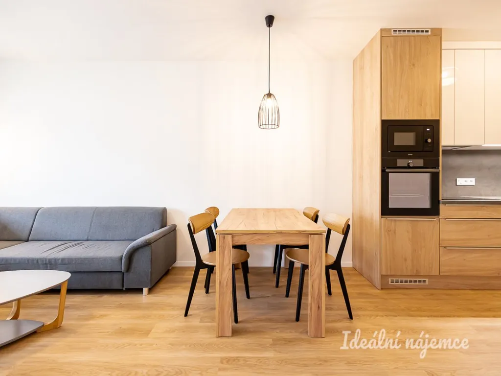 Kuchyně je vybavena indukční varnou deskou, vestavnou troubou, recirkulační digestoří a myčkou. Z obývacího pokoje a ložnice je vstup na balkon.