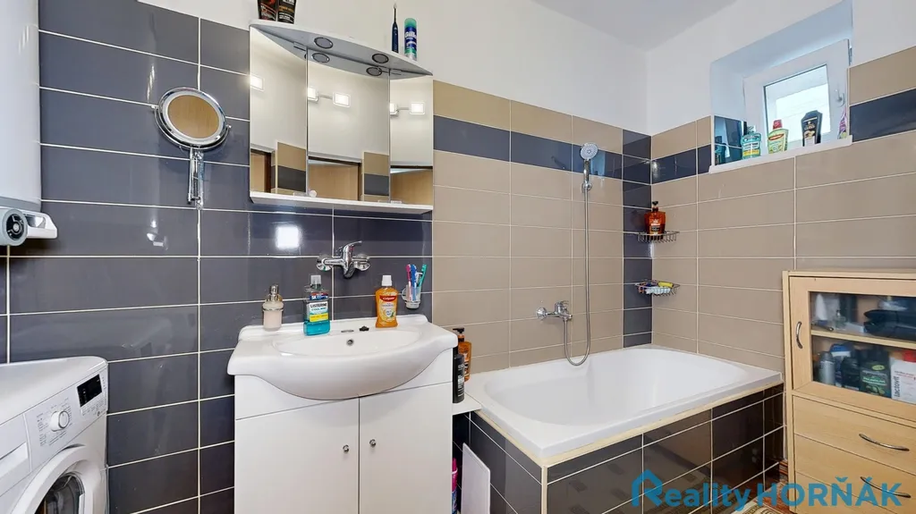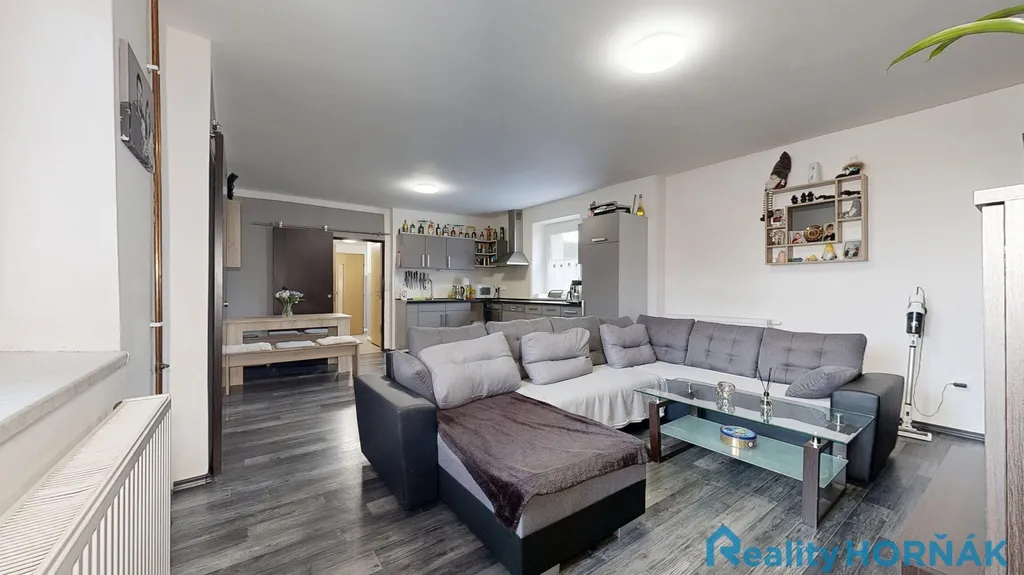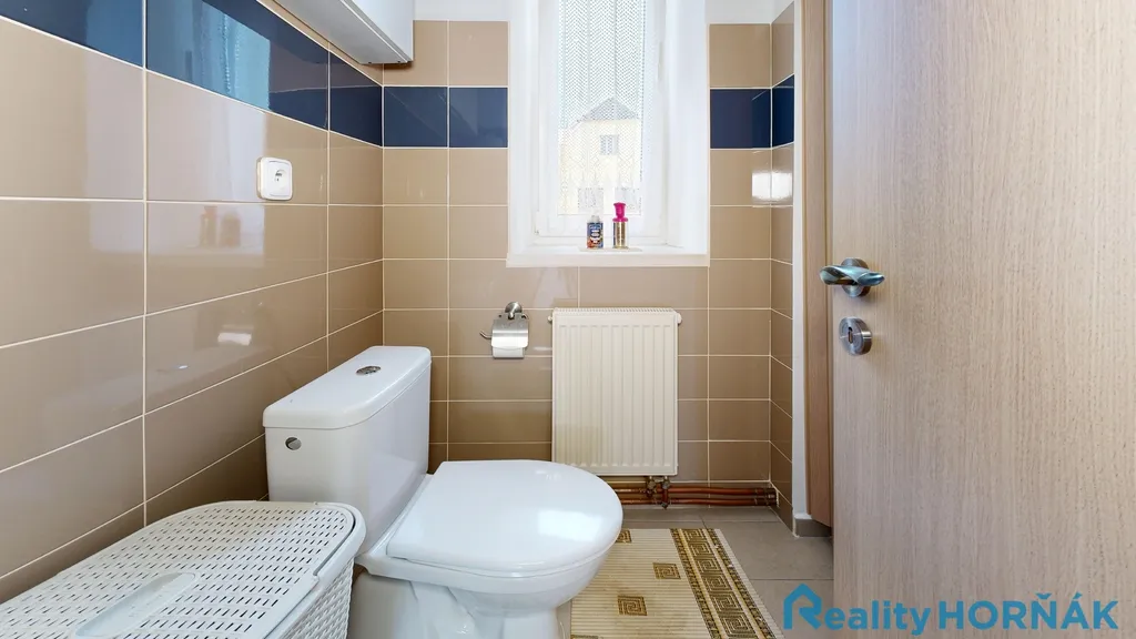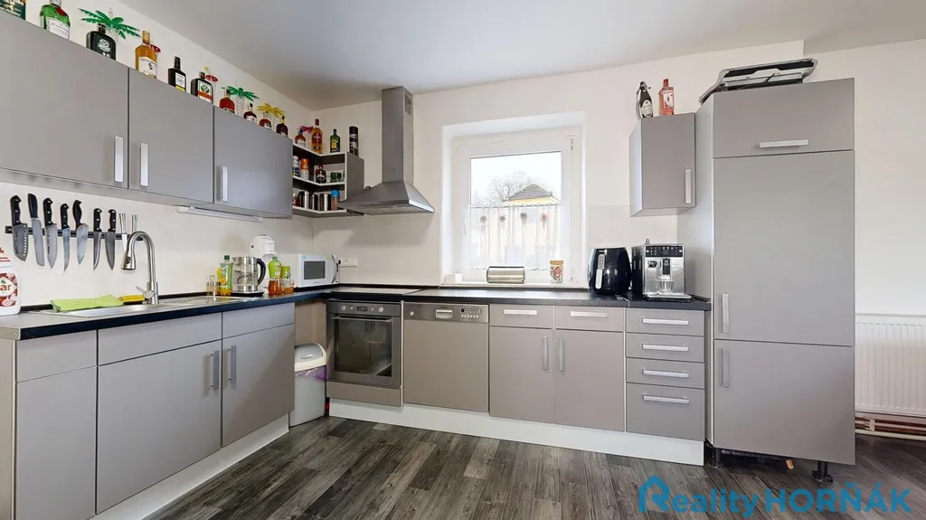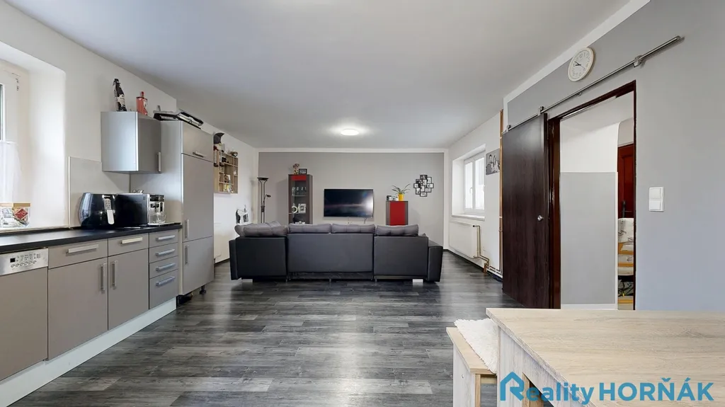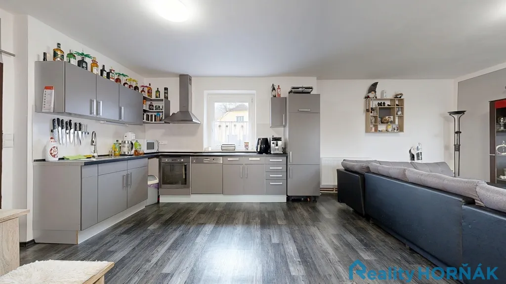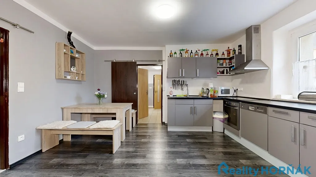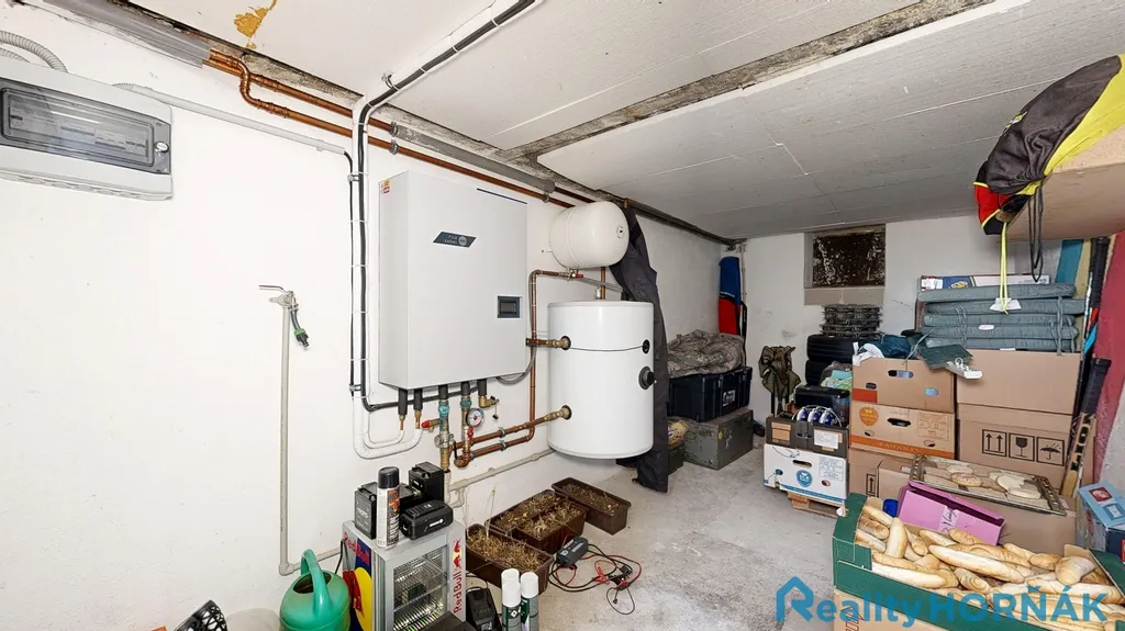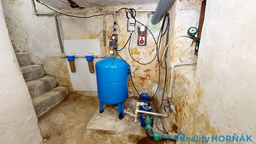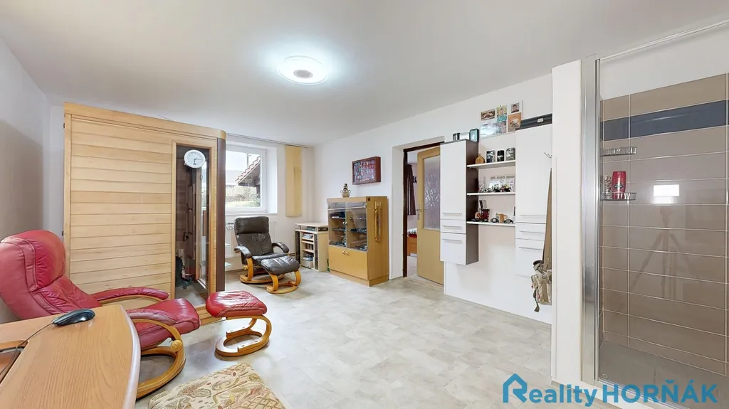 V současné době dům nabízí dispozici 5+KK, rozloženou do přízemí a obytného podkroví. V přízemí jsou situovány místnosti obývacího pokoje s kuchyňským koutem (6,40 x 5,03 = 32,2 m²), ložnice (5,05 x 4,37 = 22,1 m²), pokoj (3,56 x 3,74 = 13,3 m²), koupelna (2,37 x 2,07 = 4,9 m²), samostatné WC (1,52 x 1,52 = 2,3 m²). Dispozici přízemí doplňují místnosti vstupní chodby (3,74 x 2,55 = cca 9,5 m²), navazující komunikační část chodby (3,69 x 1,42 = cca 5,2 m²) a komora (1,33 x 1,44 = 1,9 m²). Po pohodlném schodišti vystoupáme do podkroví se komunikační chodbičkou (3,69 x 2,42 = cca 8,9 m²) a dvěma pokoji (3,69 x 4,63 = 17,1 m² a 3,69 x 4,54 = 16,8 m²). V mezipatře je vybudováno samostatné WC (1,42 x 1,46 = cca 2,1 m²). Dispozici podkroví lze případně dále rozvíjet do dosud nevyužitého půdního prostoru (3,69 x 6,74 = cca 24,9 m²). Rodinný dům dále nabízí dvě sklepní místnosti (8,30 x 1,54 = 15,4 m² a 2,30 x 5,12 = 12,6 m²). Potravinový sklep je přístupný z chodby, technický sklep ze dvora. Uvedené výměry místností vycházejí z dostupných půdorysných podkladů a z měření v rámci 3D skenu nemovitosti. Jedná se o orientační údaje sloužící pro základní přehled o dispozici; přesné výměry se mohou v drobných odchylkách lišit. Obvodovou konstrukci domu tvoří smíšené, převážně cihelné zdivo. Okenní otvory jsou osazeny plastovými okny s izolačním dvojsklem. Fasáda není zateplena. Dům kryje nová střešní krytina, položená na původním krovu. Obytné místnosti podkroví jsou zatepleny skelnou vatou. V přízemí jsou převážně betonové podlahy, kryté linem, v části jsou původní dřevěné podlahy překryté OSB deskami a opět linem. V podkroví jsou betonové podlahy, kryté linem, anebo keramickou dlažbou. V rámci modernizace domu byly provedeny nové rozvody elektřiny (měděné vodiče). Rozvody vody a odpadů jsou nové, provedené v plastu. Vodou je dům zásobován z vlastní kopané studny o hloubce cca 8–9 m. Odpady jsou svedeny do septiku s následným trativodem do pole. Vytápění je řešeno teplovodním ústředním systémem (radiátory) napojeným na tepelné čerpadlo vzduch–voda. Ohřev teplé vody zajišťuje elektrický bojler.