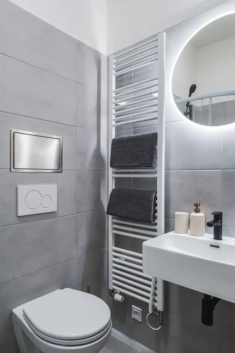 Po vstupu do bytu Vás přivítá prostorná předsíň, ze které je přímý vstup do koupelny vybavené sprchovým koutem, toaletou a pračkou se sušičkou. Následně se dostanete do světlého obývacího prostoru s kuchyňským koutem, kde je moderní kuchyňská linka s vestavěnými spotřebiči - lednice s mrazákem, myčka, trouba, indukční varná deska a další vybavení.