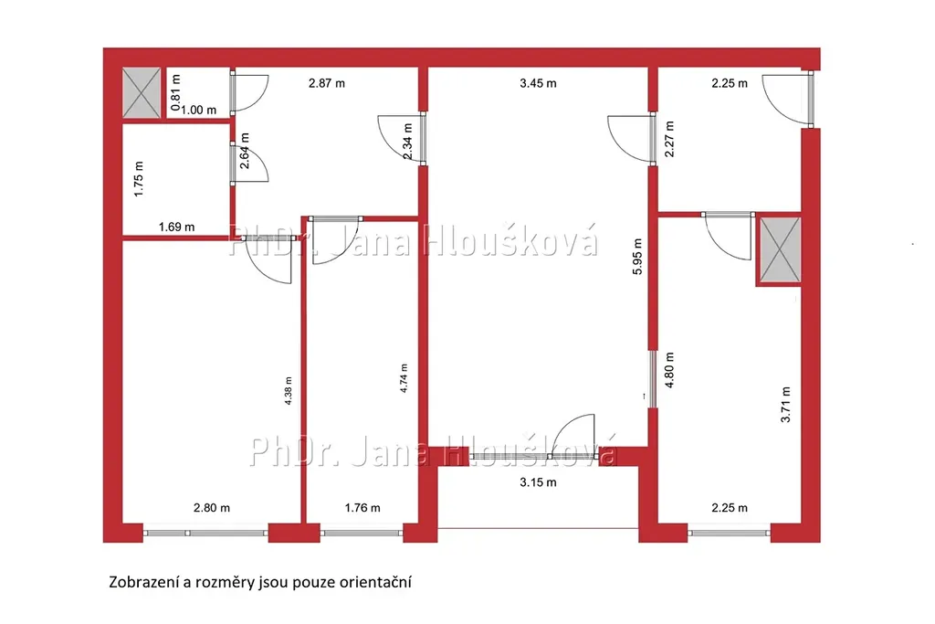 Celková plocha bytu je 66.9 m2. V této ploše není započtena plocha lodžie 3.68 m2, přístupné z bytu, a sklepní kóje v 1. podzemním podlaží domu 1.6 m2.
