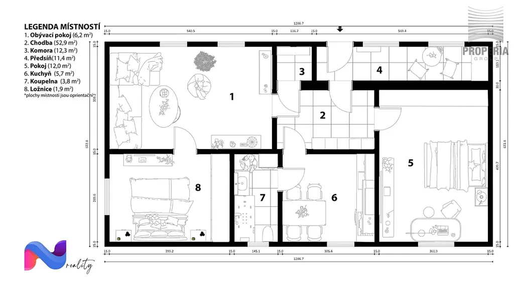 • Vstupní předsíň, centrální chodba a praktická komora pro uložení věcí.