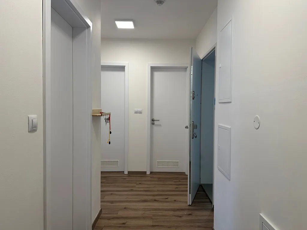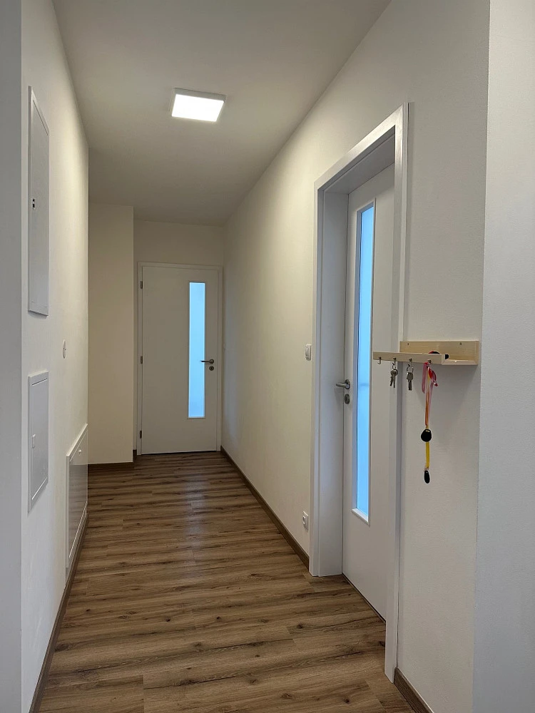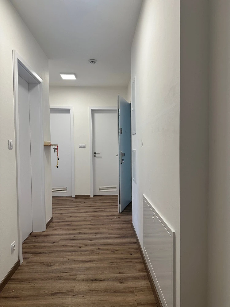 Byt je vybaven rovnou kuchyňskou linkou v moderním bílo šedém designu (součástí indukční varná deska, myčka 600 mm, led osvětlení, kvalitními venkovními roletami ve všech pokojích, videotelefon. Jedinečnou prioritou je podlahové topení - vyšší standard.