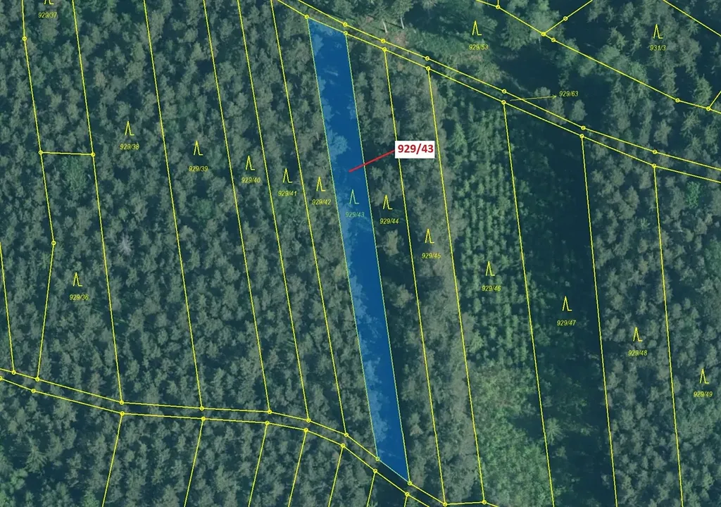 Lesní pozemek o výměře 1258 m2, parcelní číslo 929/43, podíl 1/1, katastrální území Hosty, obec Hosty, obec s rozšířenou působností Týn nad Vltavou, okres České Budějovice, Jihočeský kraj.