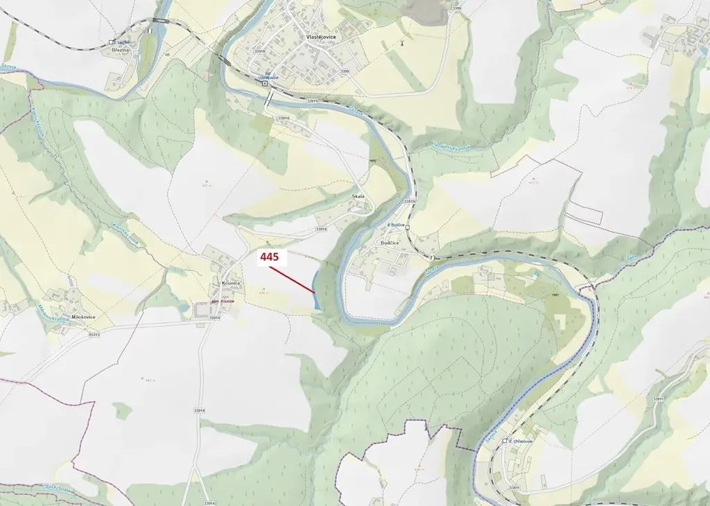 Lesní pozemek o výměře 2721 m2, parcelní číslo 445, podíl 1/1, katastrální území Kounice nad Sázavou, obec Vlastějovice, obec s rozšířenou působností Kutná Hora, okres Kutná Hora, Středočeský kraj.