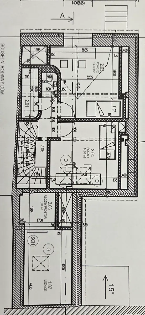 Do zadní části domu se přesuneme spojovací chodbičkou, ze které je i vstup do technické místnosti a východ na terasu se dvorem. V zadní části je samostatná ložnice s vlastní koupelnou, toaletou a úložným prostorem. Na ložnici Vás zaujme vysoký strop se střešním oknem, díky kterému působí vzdušně a prostorně.