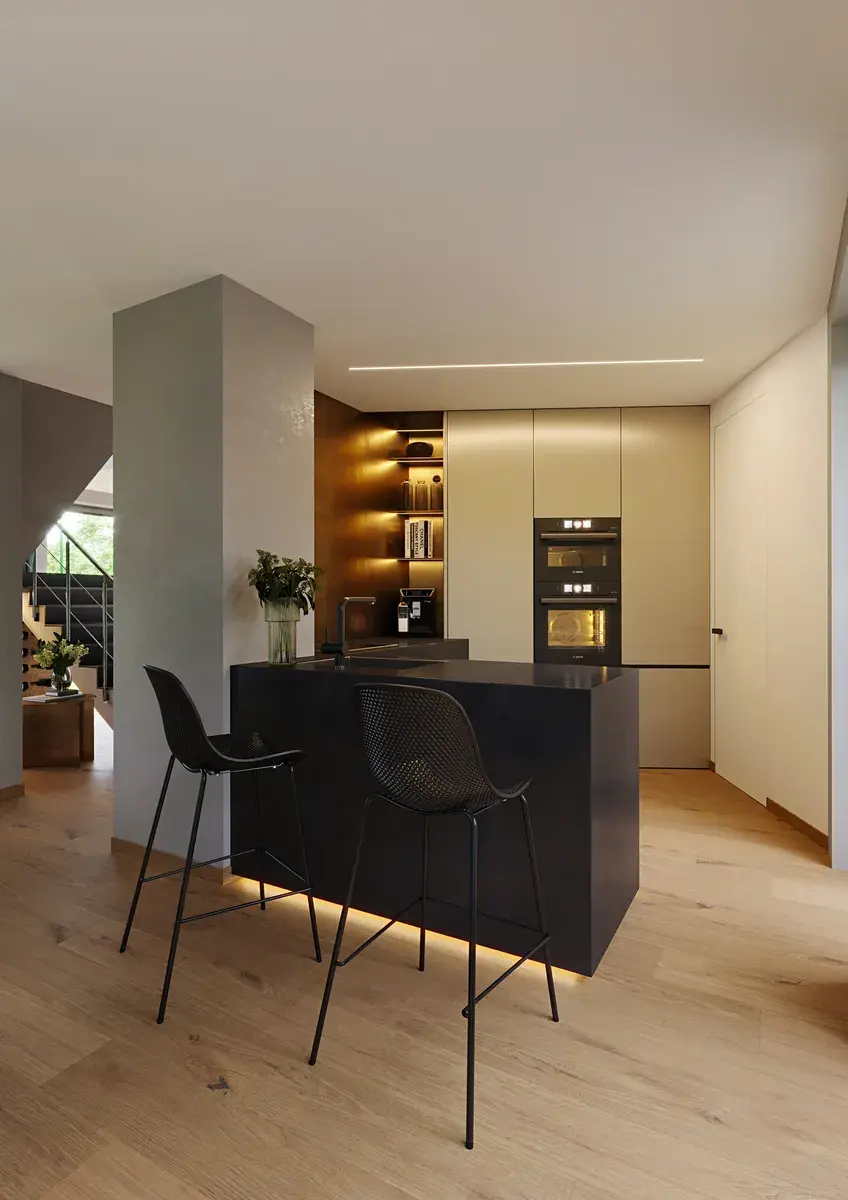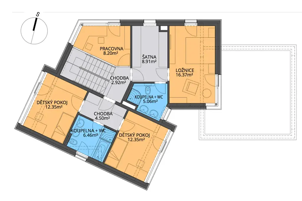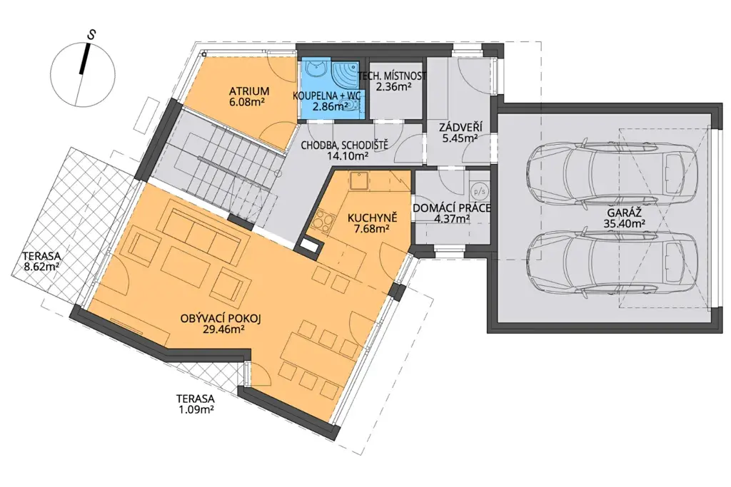 V přízemí vás uvítá prostorný obývací pokoj propojený s kuchyní, odkud se vychází na terasu i do atria. Samostatná pracovna, koupelna, technická místnost a garáž pro dva vozy zajišťují praktičnost domu. V patře pak najdete dvě dětské ložnice, hlavní ložnici se šatnou, druhou pracovnu a dvě koupelny, každý člen rodiny tak má své soukromí.