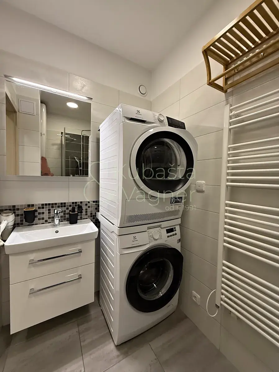 K dispozici jsou také dvě samostatné ložnice, částečně vybaveny a zařízeny. V chodbě pak máme samostatnou toaletu a koupelnu, vybavenou sprchovým koutem, zrcadlem a koupelnovou stěnou, pračkou a sušičkou, topným žebříkem a elektrickým ohřívačem vody.