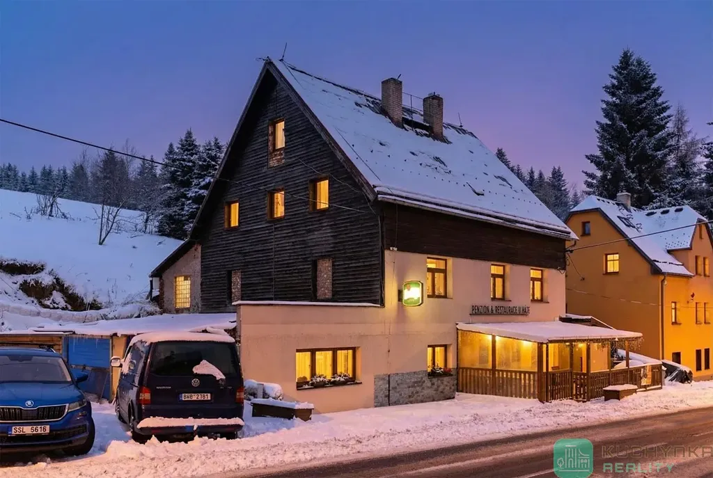 V nejnavštěvovanější části Krušných hor mám pro Vás na prodej Penzion s 35 lůžky a restaurací a to pouhé 3 km od severního parkoviště pod Klínovcem. Penzion se nachází na hlavní cestě směrem na Vejprty. Přímo naproti penzionu je zastávka skibusu. Díky česko-německému projektu je možné lyžovat na jeden skipas i za hranicemi ve ski areálu Fichtelberg. Od jara do podzimu je v provozu bikepark na Klínovci. V okolí řada turistických tras a cyklostezek, krásné lesy na houbaření. Místo, které má neuvěřitelný potenciál. Kousek od penzionu vede úzká silnička vhodná i pro pěší (Stezka Českem) na nádraží Kovářská a na druhou stranu na Klínovec.