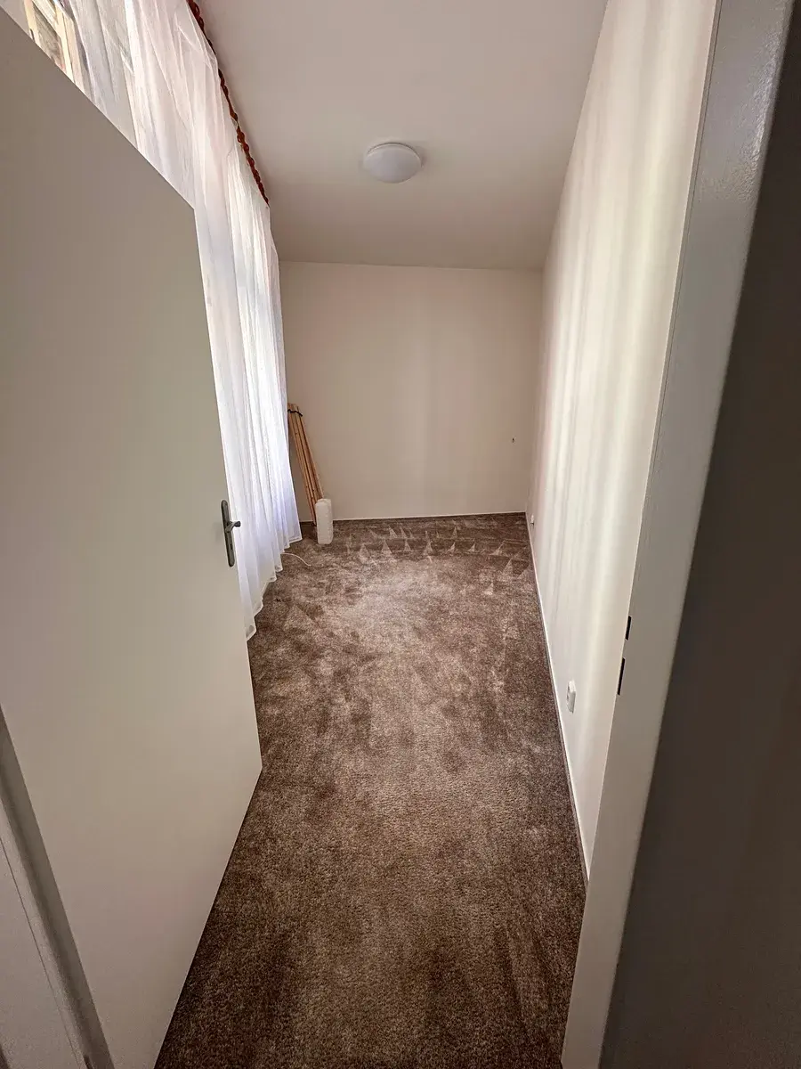 Okna jsou dřevěná, na podlaze jsou koberce a dlažba.