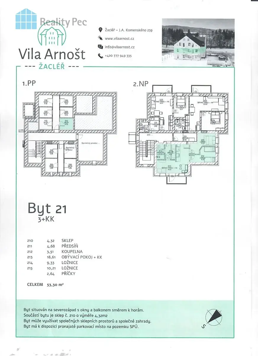 Nabízíme k prodeji kompletně zrekonstruovaný byt ve vile Arnošt v části obce Žacléř, situovanou na adrese J. A. Komenského. Tento byt poskytuje dostatek prostoru a je vhodný jak k trvalému bydlení, tak k pronájmu. Může být ideální místem k bydlení či k rekreaci nebo investicí pro ty, kteří hledají výnosný projekt v oblasti realitního trhu. Vila prochází kompletní rekonstrukcí a disponuje celkem 9 byty s balkónem. Byt ve 2.NP o dispozici 3+kk je situován na severozápad s okny a balkonem směrem k horám. Součástí bytu je sklep o výměře 4,32 m2. Byt má k dispozici parkovací místo přímo u domu na pronajatém pozemku.