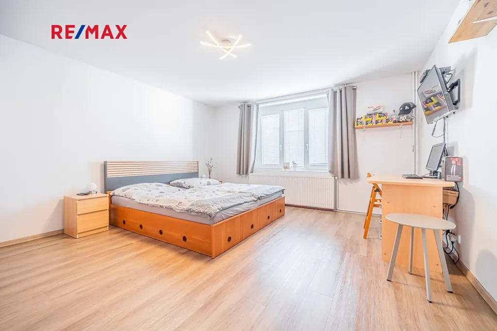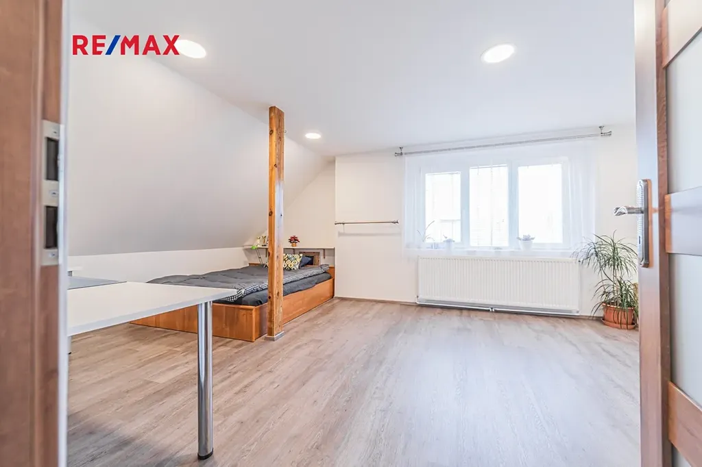 Patro: do patra se jde po zděných schodech. Zde je největší pokoj v domě (24 m2) + menší pokoj (12 m2), kterým se vchází na velkou terasu, která je na jihozápadní stranu s možností krásného výhledu do okolí. V prvním patře je také místnost (15 m2 - momentálně využívaná ke skladování), kterou je možné rekontruovat a využít dle potřeb (možno i jako koupelna s WC).