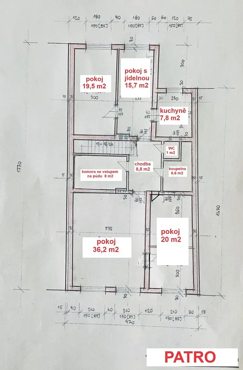 Bytová jednotka v patře je dispozičně řešena jako 4+1 – 115,6 m2 (pokoj 36,2 m2, pokoj 20 m2, pokoj 19,5 m2, pokoj s jídelnou 15,7 m2, kuchyně 7,8 m2, koupelna 6,6 m2, samostatné WC 1 m2, chodba 8,8 m2).